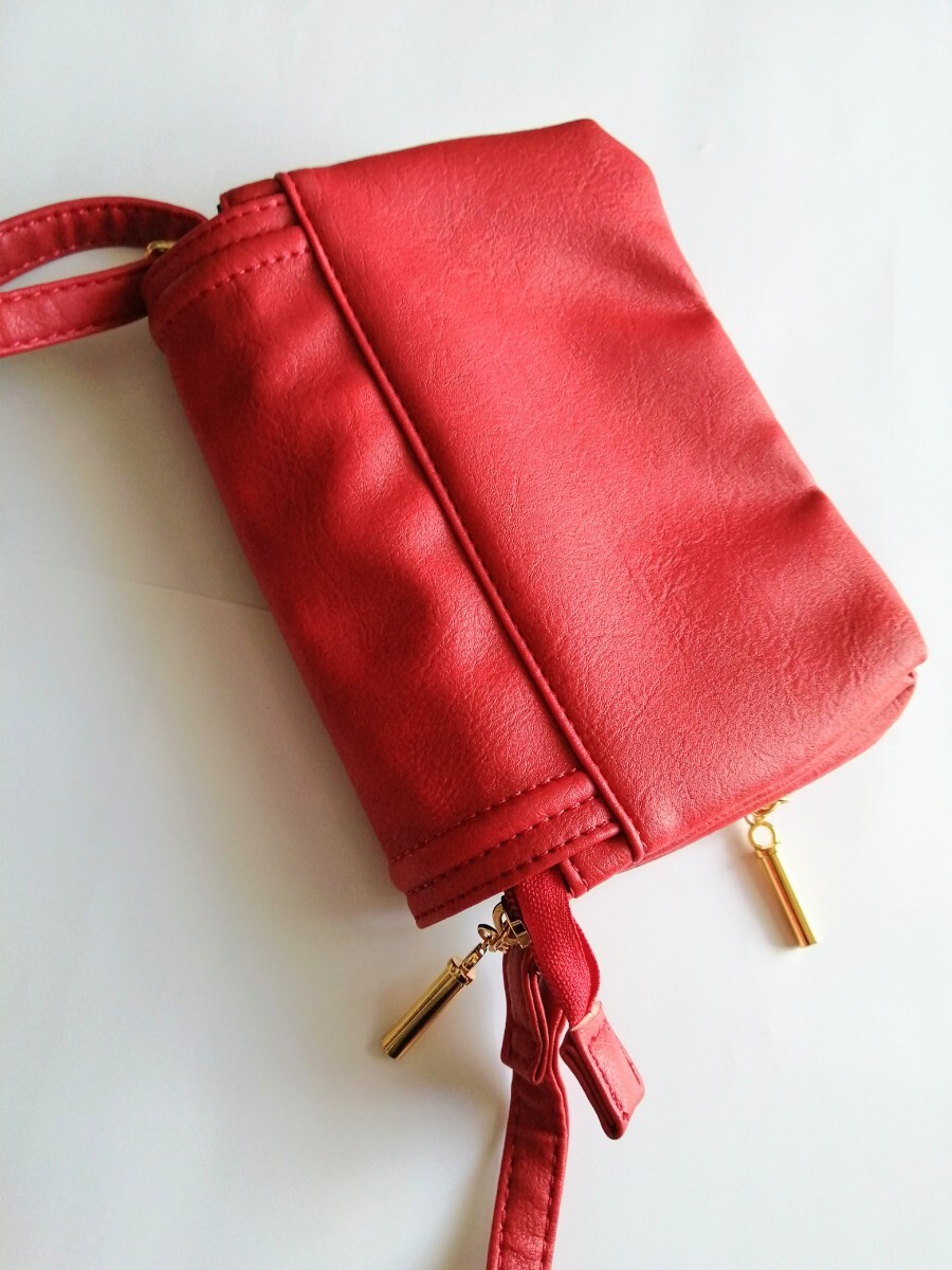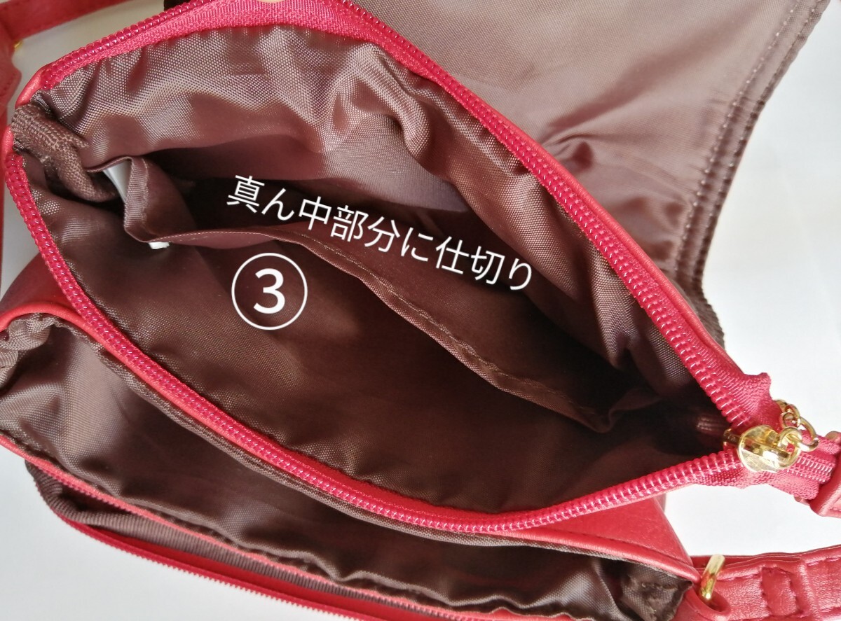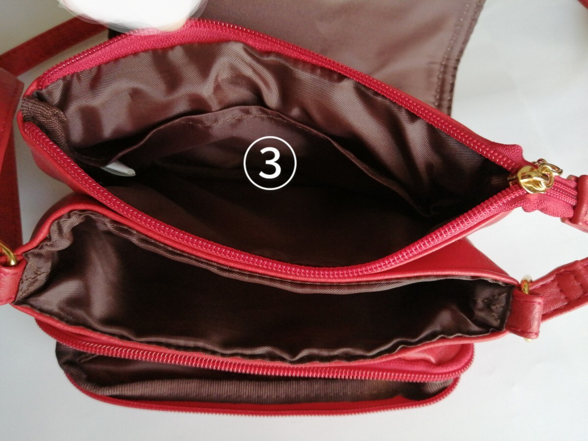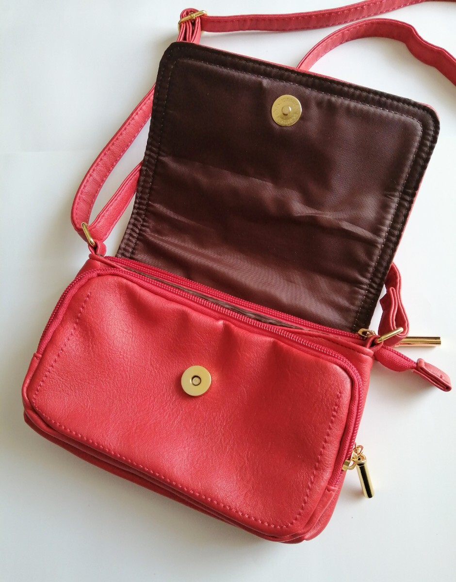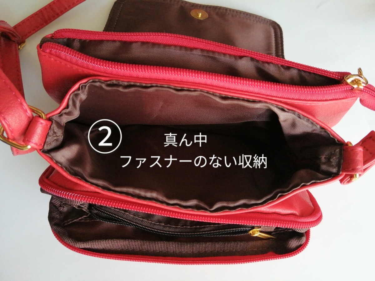 美品「Sourire 収納たっぷりショルダーバッグ 柔らか皮革 朱色系レッド」カード収納 仕切り沢山でお財布バッグ、スマホショルダーにも