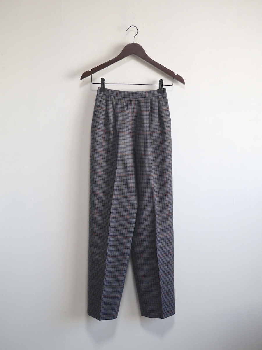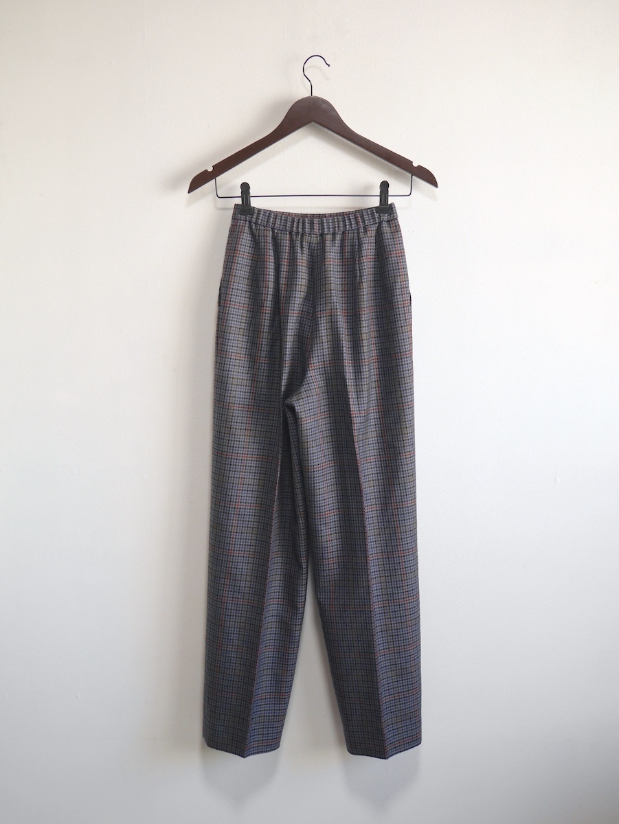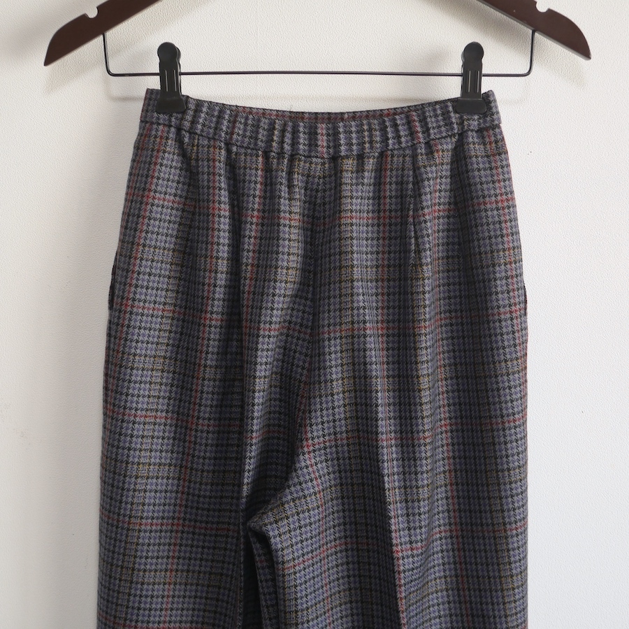 後ろウエストがゴムになったハイウエストのチェックパンツ。 センタープレスの入ったきれいなテーパードシルエットで幅広いコーデに対応。 ウールですが真夏以外は着用していただける生地です。
