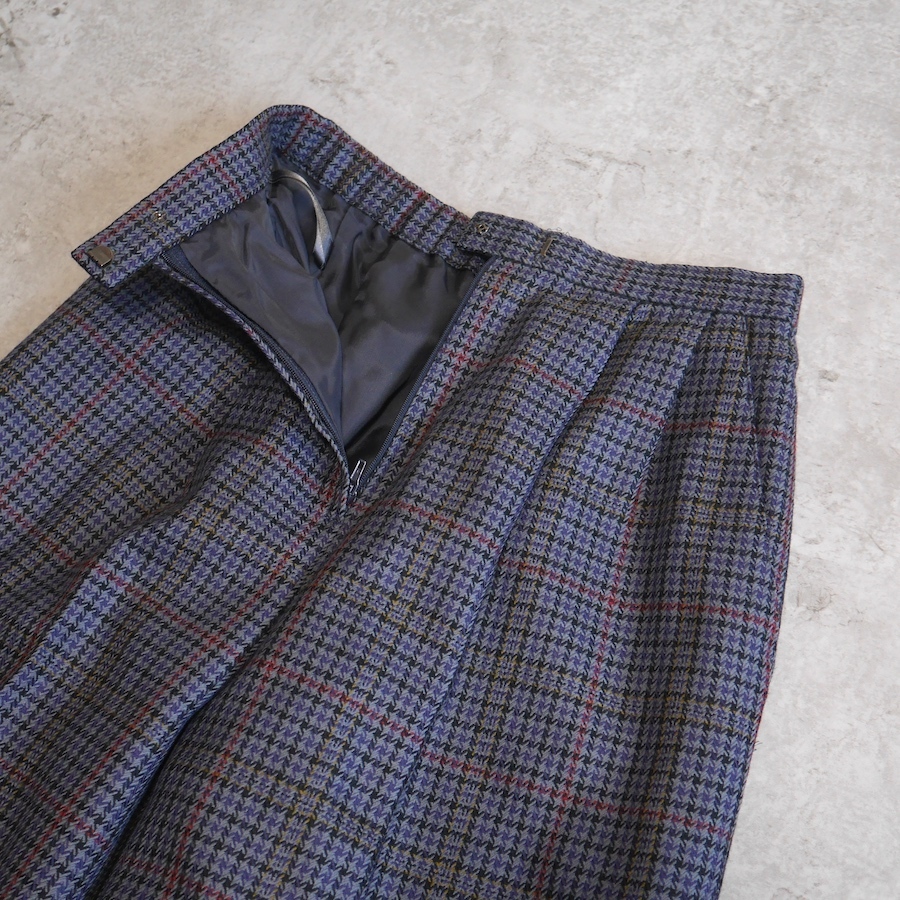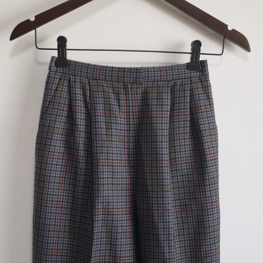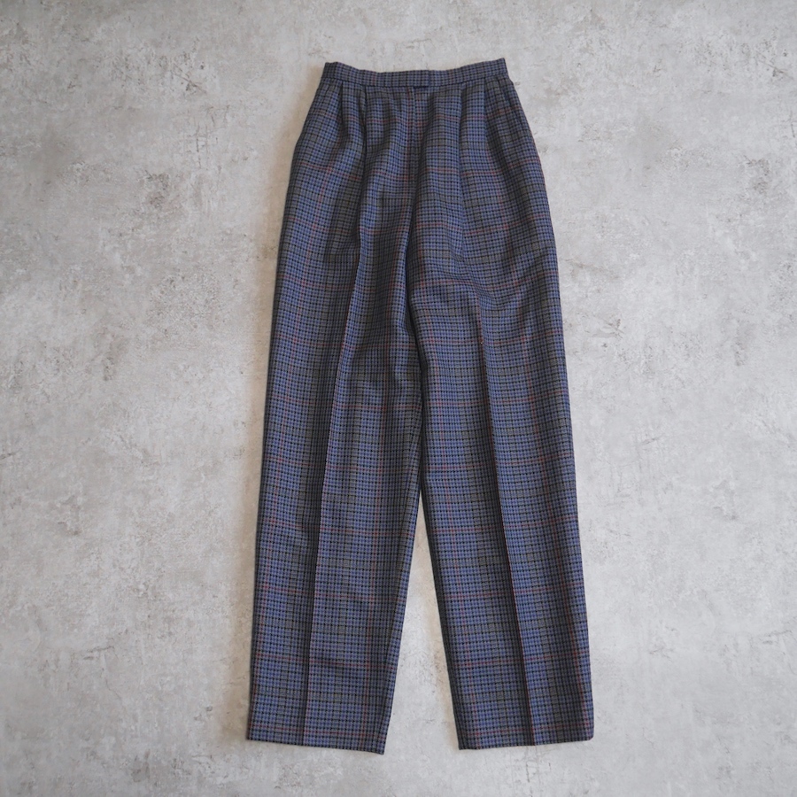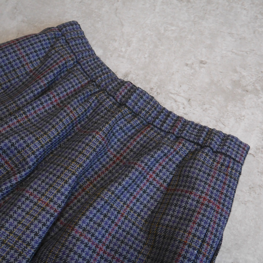 後ろウエストがゴムになったハイウエストのチェックパンツ。 センタープレスの入ったきれいなテーパードシルエットで幅広いコーデに対応。 ウールですが真夏以外は着用していただける生地です。