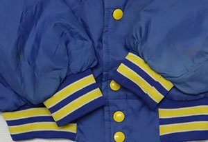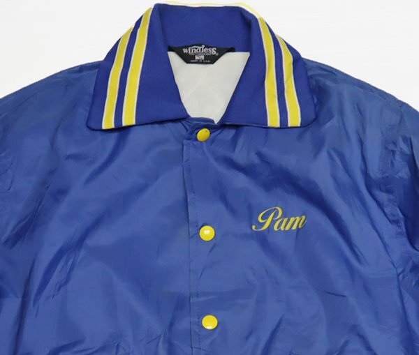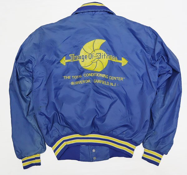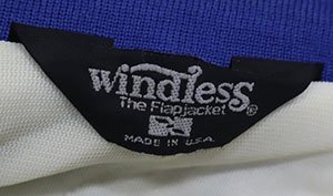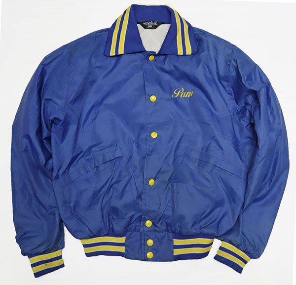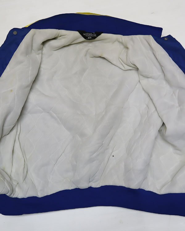 80-90年代頃のアメリカ製のナイロンジャケットで裏地内装もナイロンの中綿入りの青系x白系x黄色系ラインです。