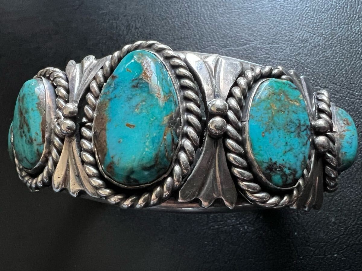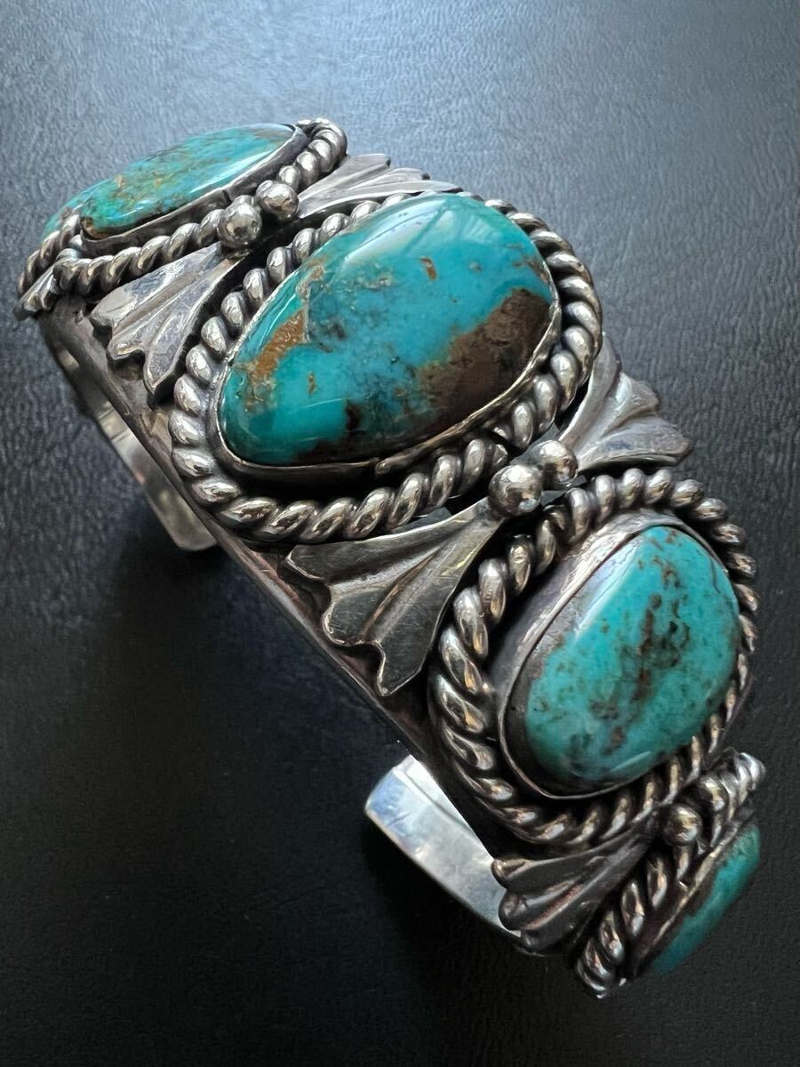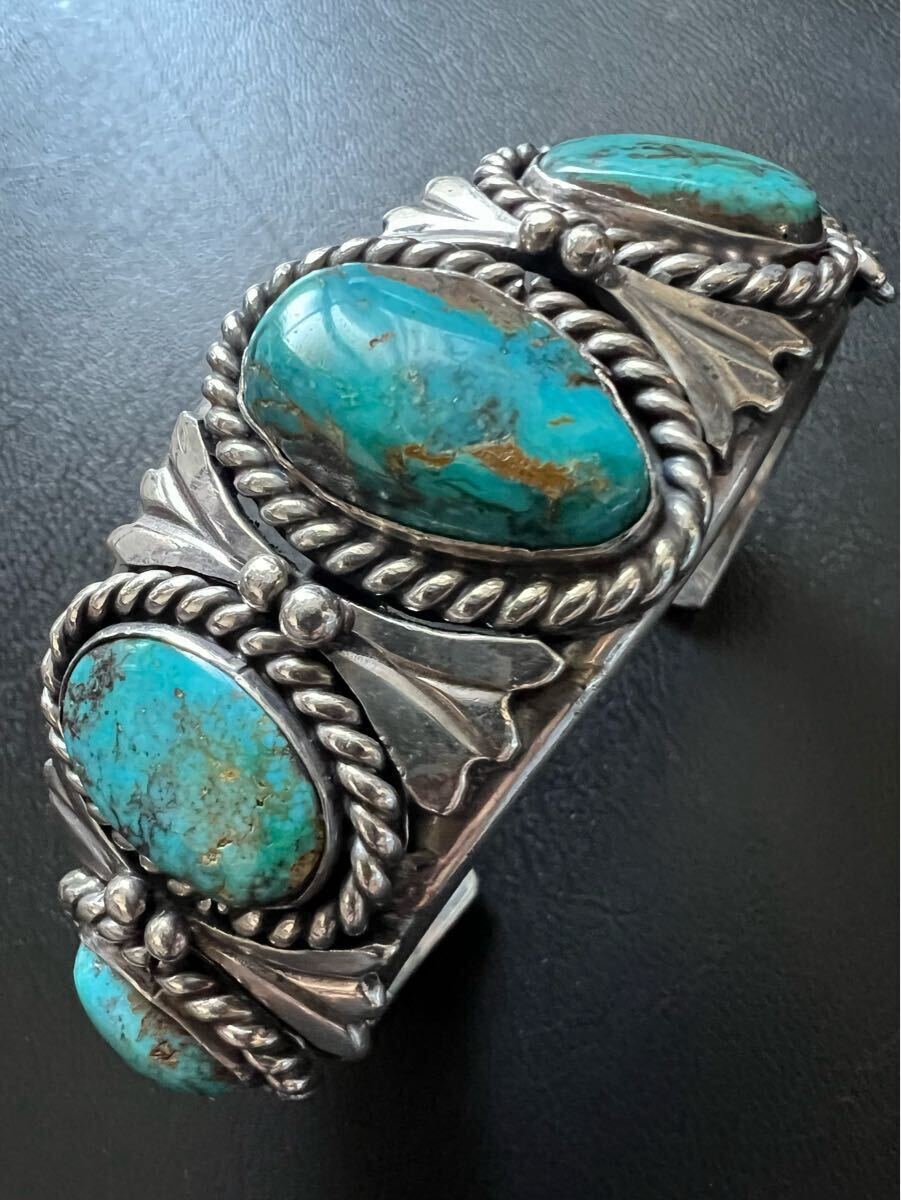 以前手放したこの作品と同じアーティストにより全く同じように制作されたハイエンドの5ローンマウンテン・ターコイズ・バングルを所持しており、そのバングルと共にペアバングルとして制作されていますので、こちらも同様ハイエンドのターコイズではあります。