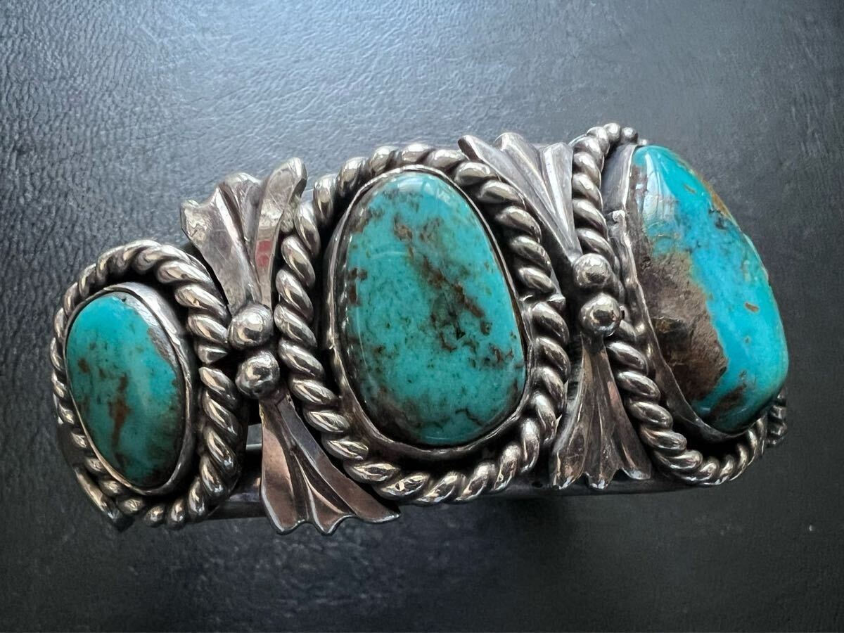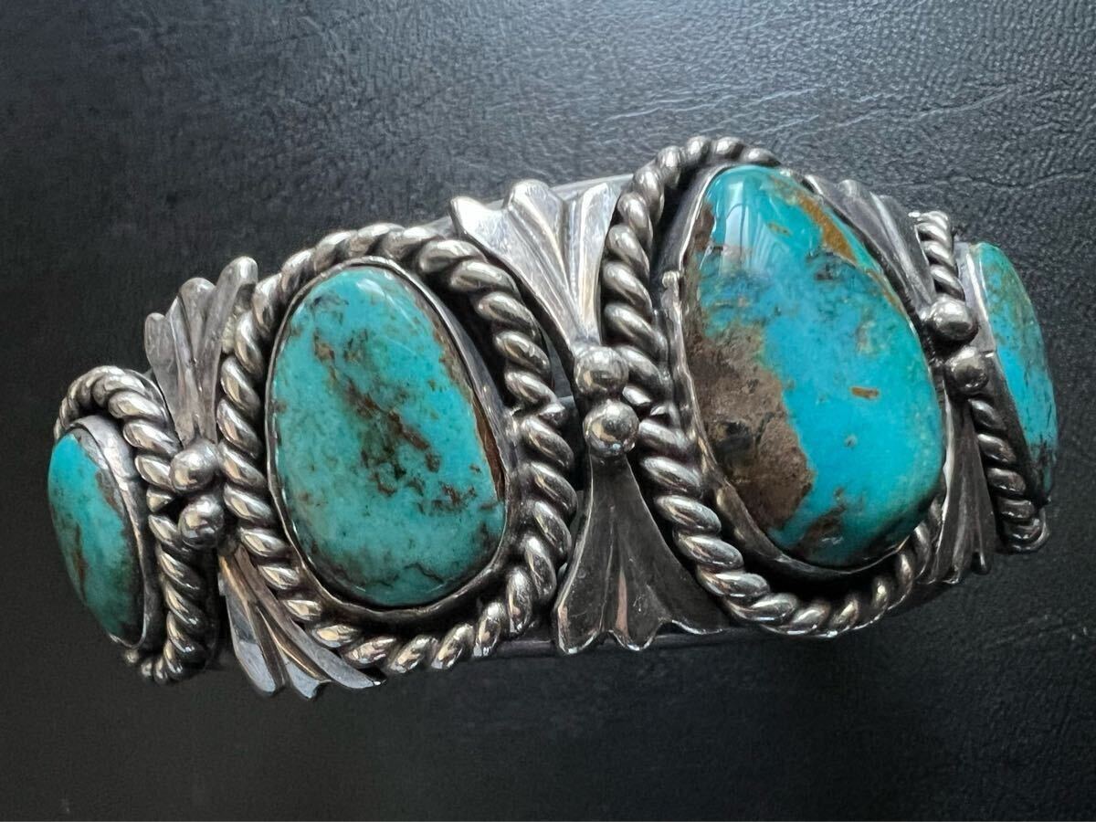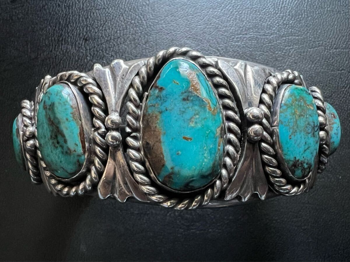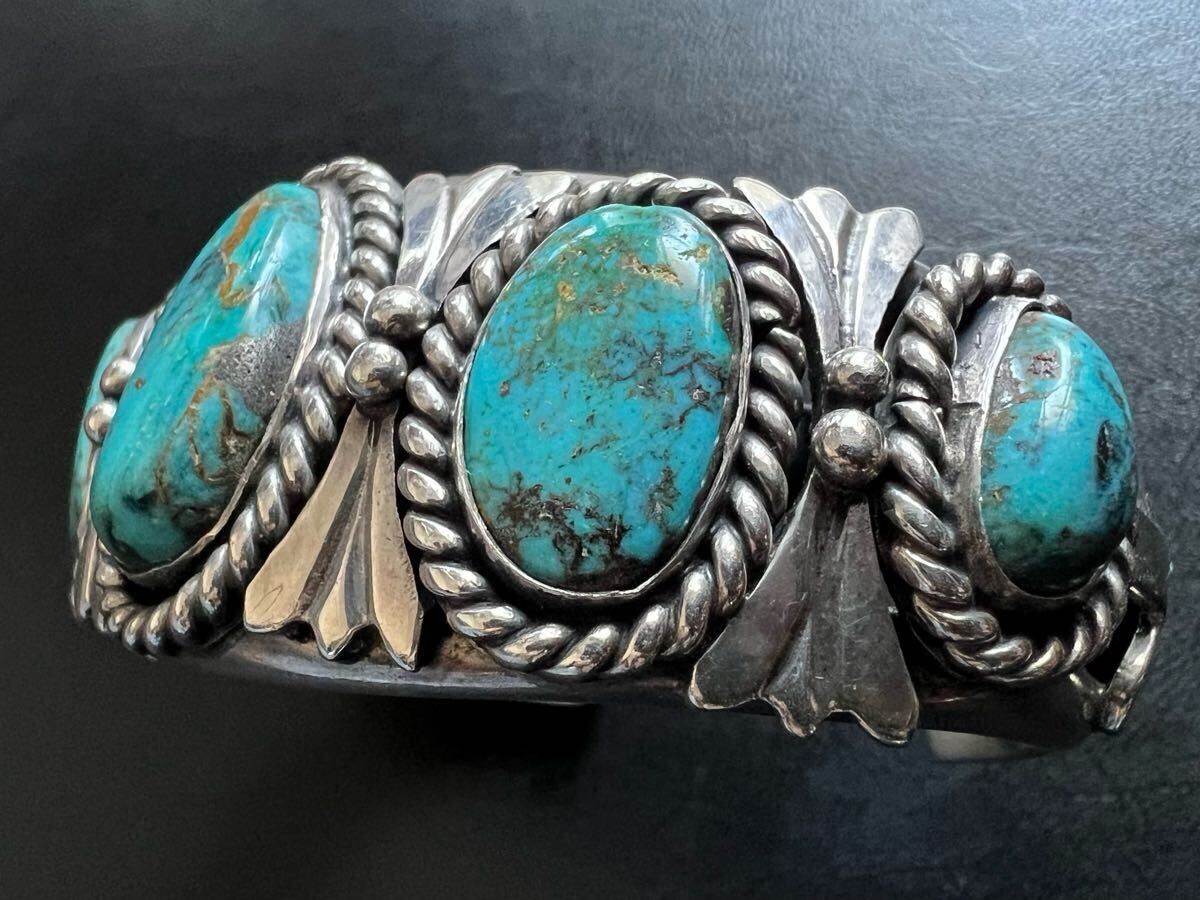 以前手放したこの作品と同じアーティストにより全く同じように制作されたハイエンドの5ローンマウンテン・ターコイズ・バングルを所持しており、そのバングルと共にペアバングルとして制作されていますので、こちらも同様ハイエンドのターコイズではあります。