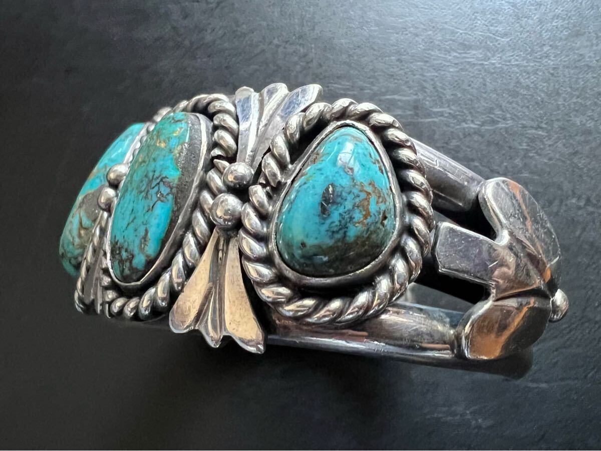 こちらのOLD PAWNの1950~60年代に制作された作品で、ingotから叩き出した3本のスプリットアームに5個のハイグレードのターコイズをセット、その周りをワイヤーワーク・アップリケ・ドロップでデコレーションし、シンプルながらゴージャスに彩られたマスターピースになります。