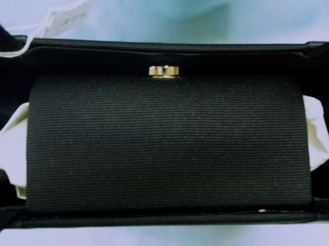黒地のレースのような生地に中央にリボンをあしらったかわいらしいバックです。冠婚葬祭など使えます。●サイズ:縦21×横16×マチ約8cm素材:ポリエステル 接写の加減で多少色が実物と異なる場合がございますのでご了承のうえ落札してください *実際にご覧になりたい方は御連絡の上御来店ください。03-3663-7071(きもの遊着苑・杉山(株)) <発送・ご要望>土曜・日曜・祝日を除く10:00~17:00までとなります