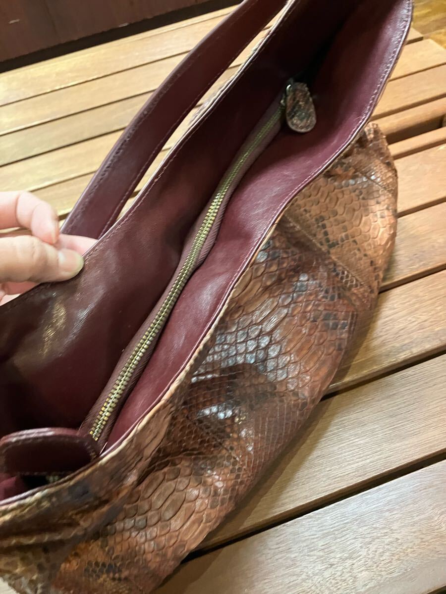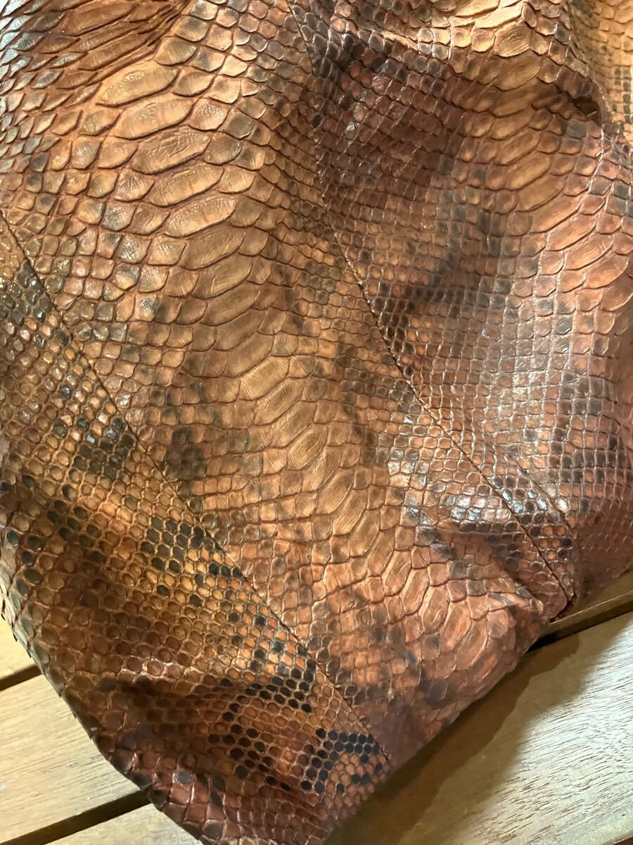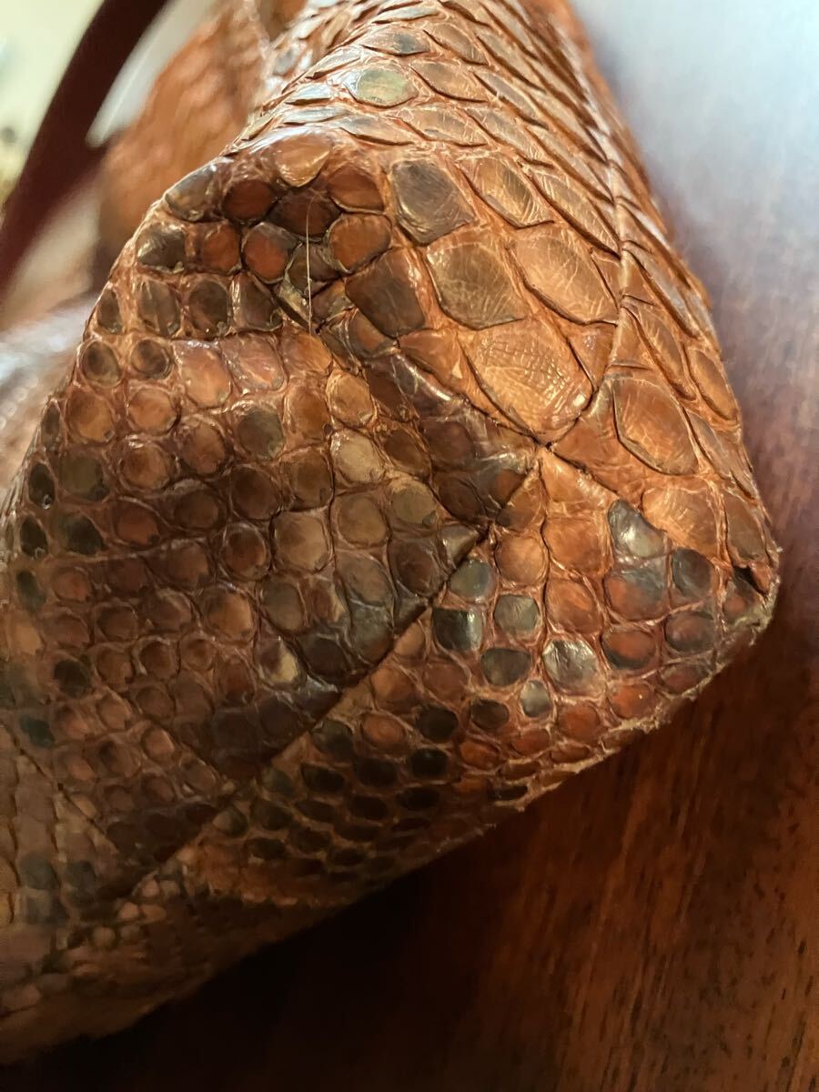 蛇革のような気もしますが、詳しくはわかりません。(修理の方のお話では、本革で10万以上する貴重なバックだといわれました)
