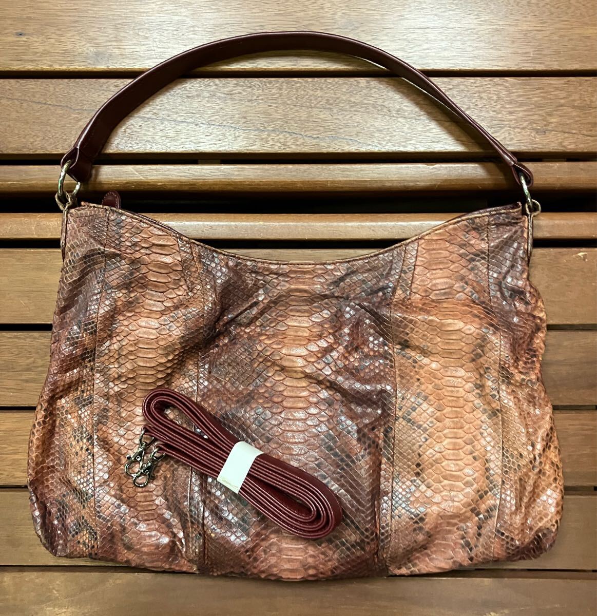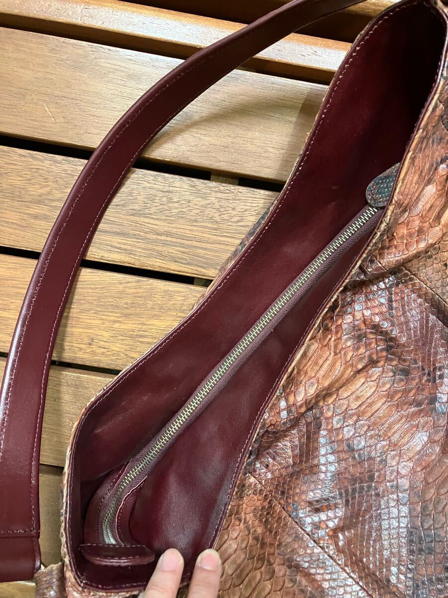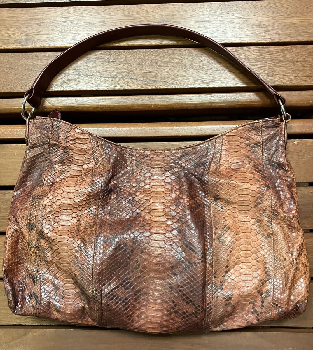 蛇革のような気もしますが、詳しくはわかりません。(修理の方のお話では、本革で10万以上する貴重なバックだといわれました)