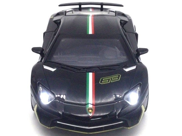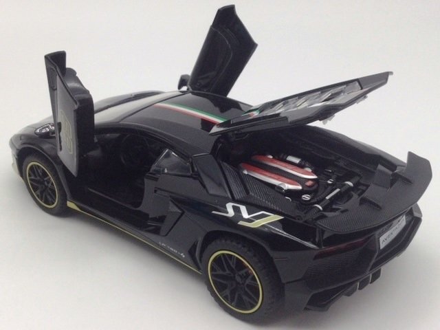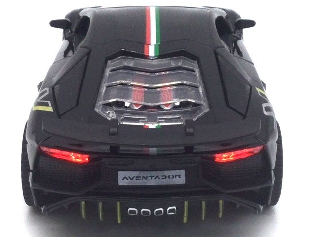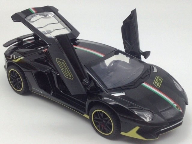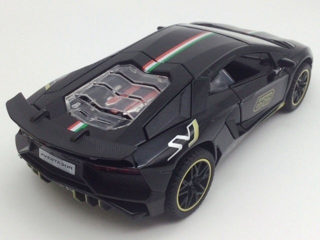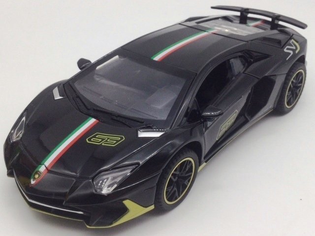 MINI AUTO社製 ランボルギーニ アヴェンタドール LP780-4のリバリーエディション ヘッドライト&テールライト点灯 エンジン音&クラクション レーシーな雰囲気のカラーリングを施したのがリバリー エディションです。 プルバックアクション付きですので チョロQのように走らせる事が出来ます。 スケールは1/32 ボタン電池のLR-44を3個(新品)お付けいたしますので、 ご自身で電池のセットをお願いいたします。 電池の組み込み、交換には小さめのプラスドライバーが必要です。 サイズ:全長約15 cm×高さ約4 cm×幅約6.8cm ボディはダイキャストメタル製。 シャーシや内装はプラスチック製。 ドア(運転席、助手席)を開けるとエンジン音やクラクションが鳴り ヘッドライトとテールライトが点滅します。 車体の前部分(ボンネット付近)を上から押すとエンジンスタート音と 走行音が鳴り、ヘッドライト&テールライトも点灯。 リアゲート開閉可能、エンジンルーム再現。 両サイドドア(ガルウィングドア)開閉可能。 ※こちらの商品は箱入りではございませんのでご注意下さいませ。 神経質な方にはお勧めできません *1台1台検品し、丁寧に梱包しておりますが、 輸入時からの微かな汚れ、傷がある場合がありますのでご了承下さい。 |