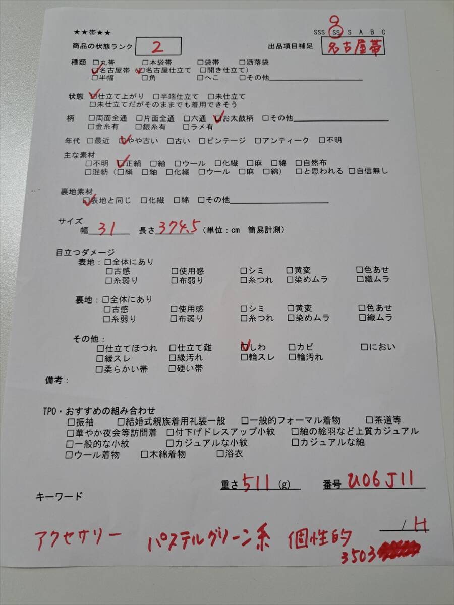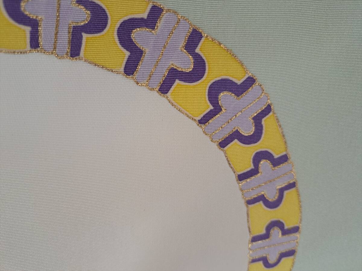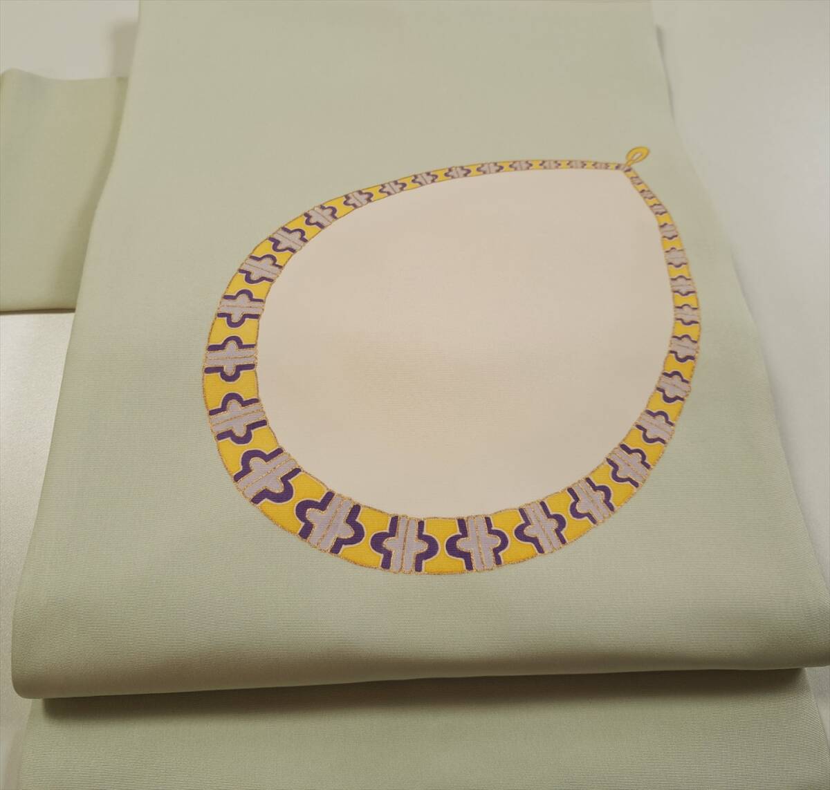 即決■着物の越田■幅31長さ374.5 正絹 名古屋帯 名古屋仕立て お太鼓柄 アクセサリー パステルグリーン系 個性的 美品 H◇ひ06J11