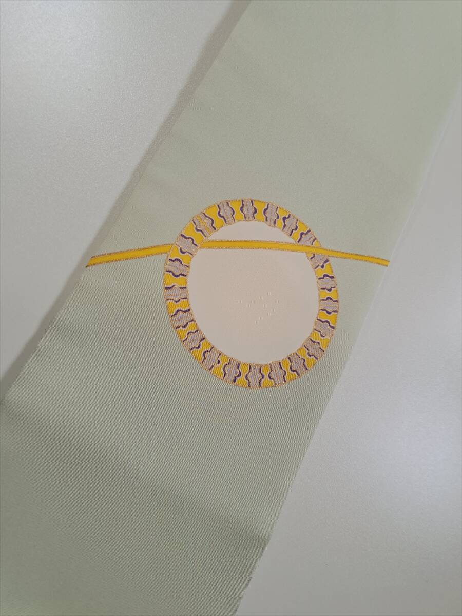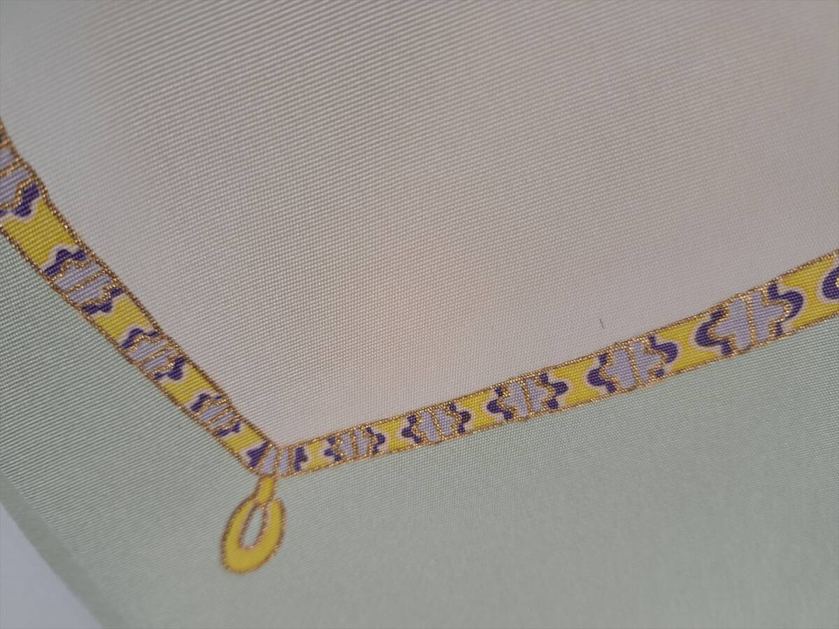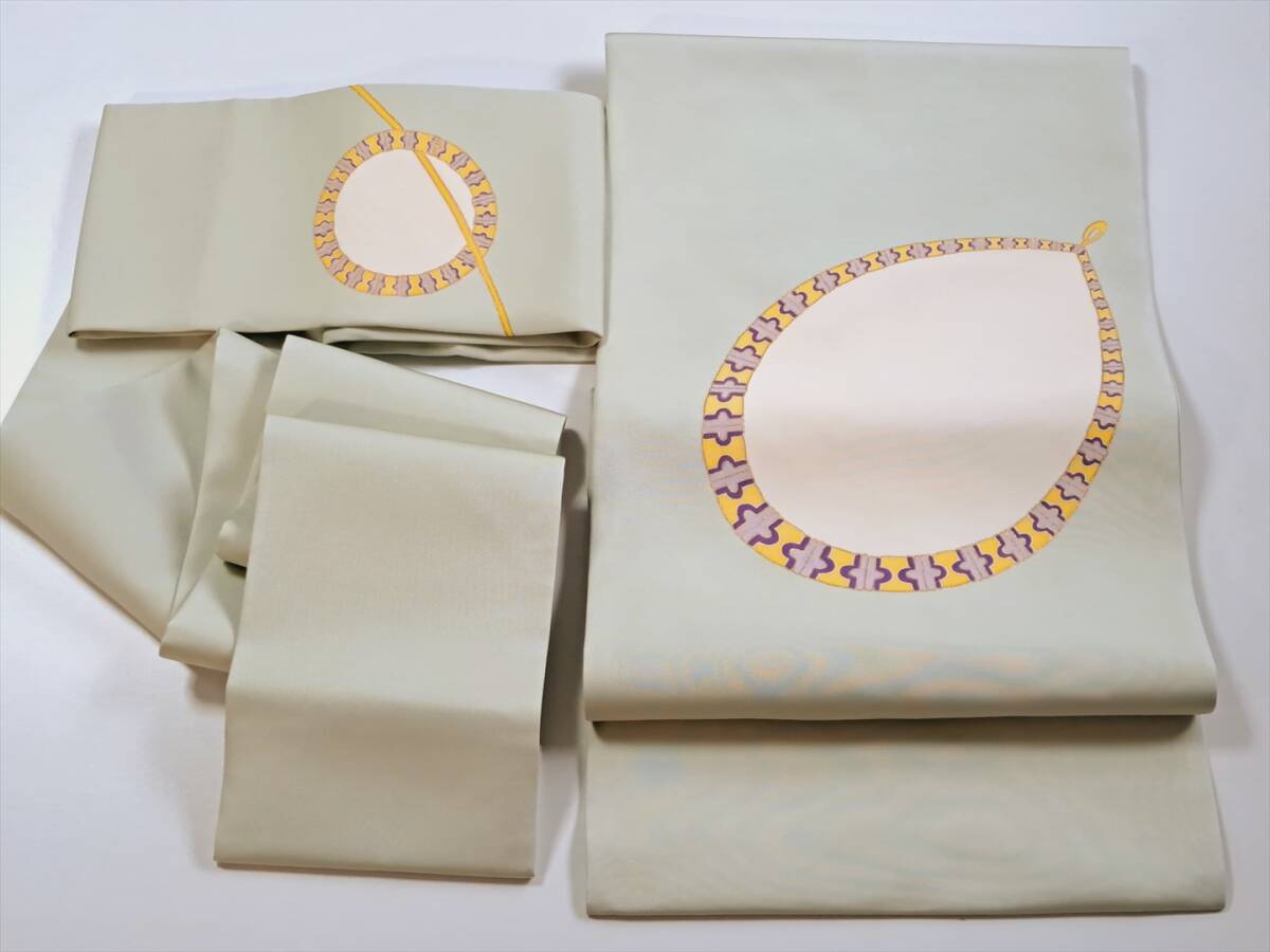 即決■着物の越田■幅31長さ374.5 正絹 名古屋帯 名古屋仕立て お太鼓柄 アクセサリー パステルグリーン系 個性的 美品 H◇ひ06J11