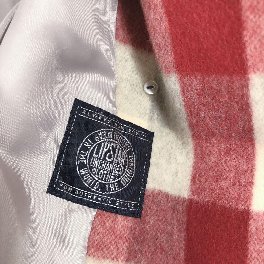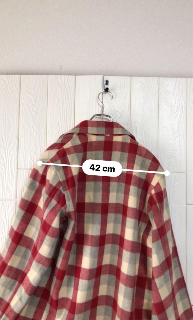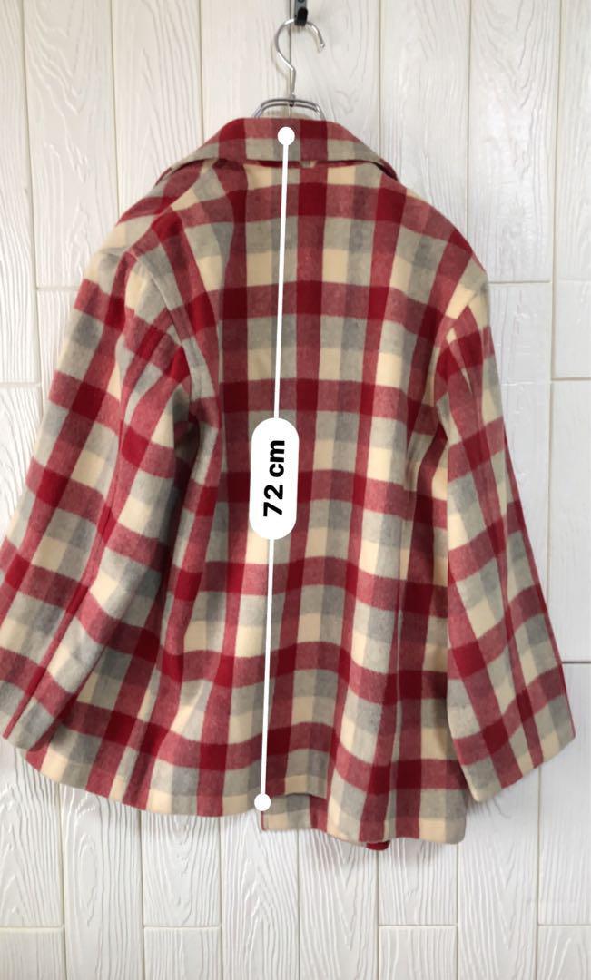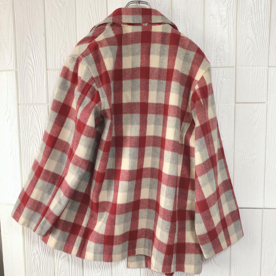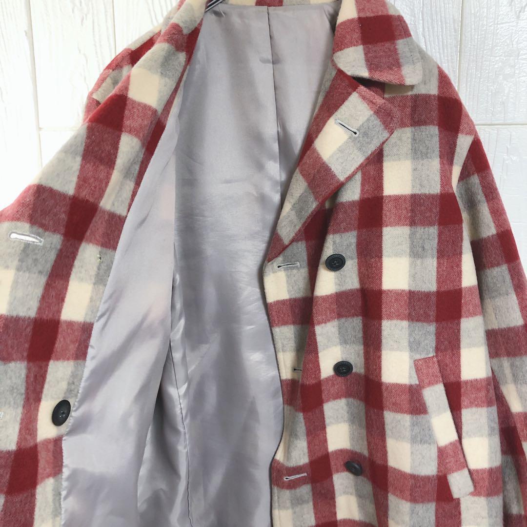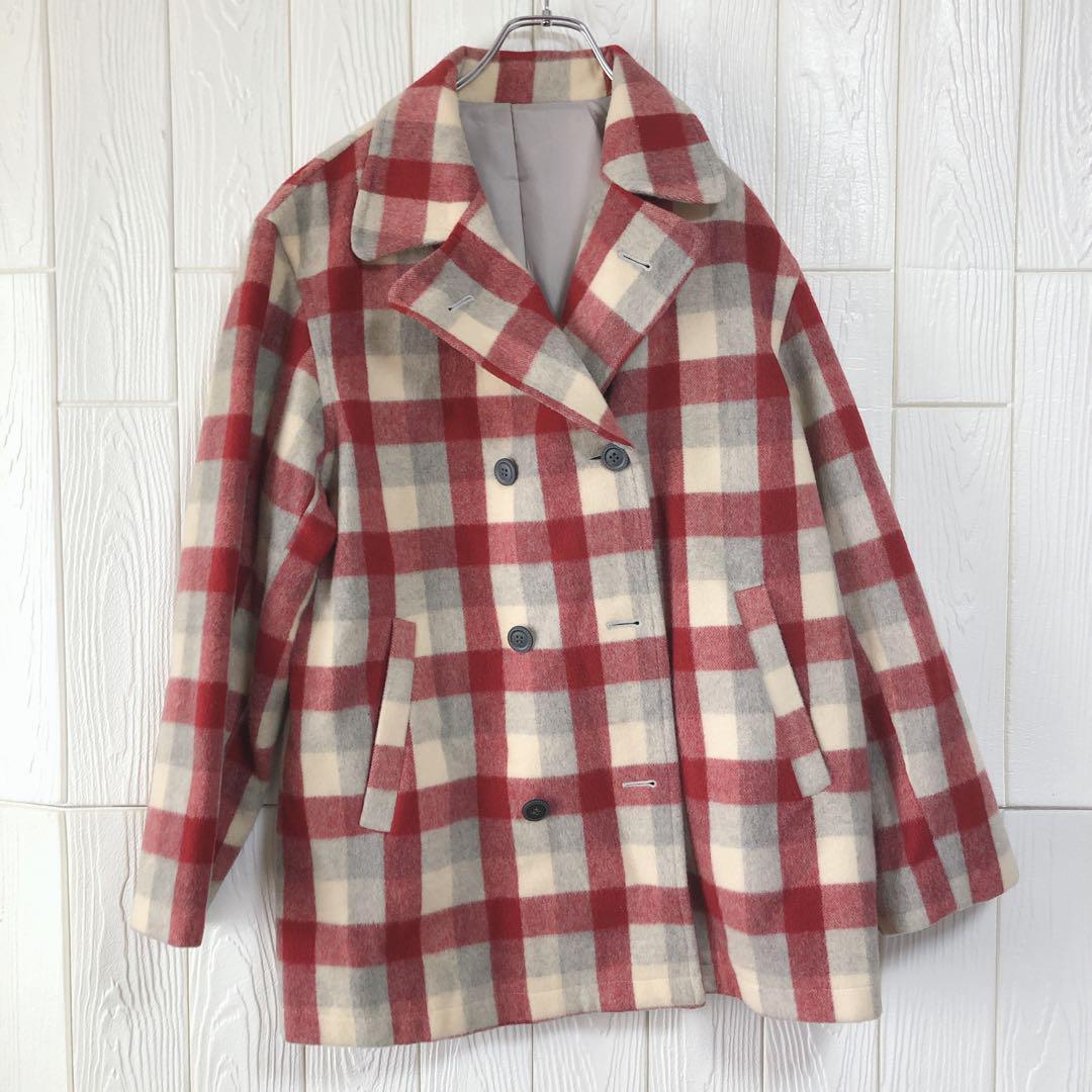 赤とクリームのチェック柄のウールピーコート、スタイリッシュで温かいデザイン。