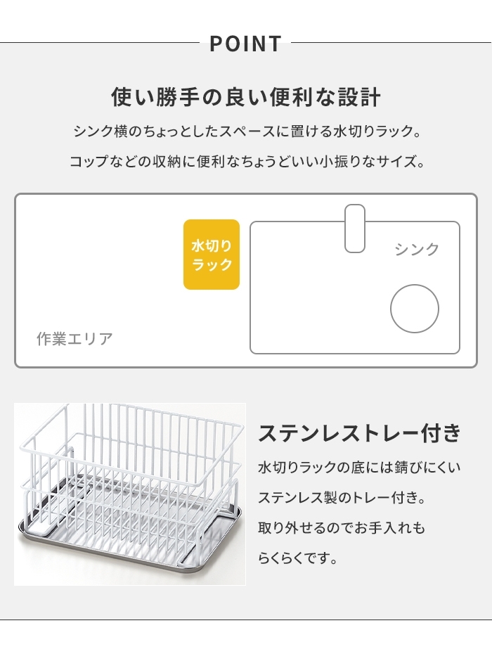 | コップなど置くのに便利な小ぶりサイズの水切りラック。 サビにくいステンレストレーと使用しています。 |