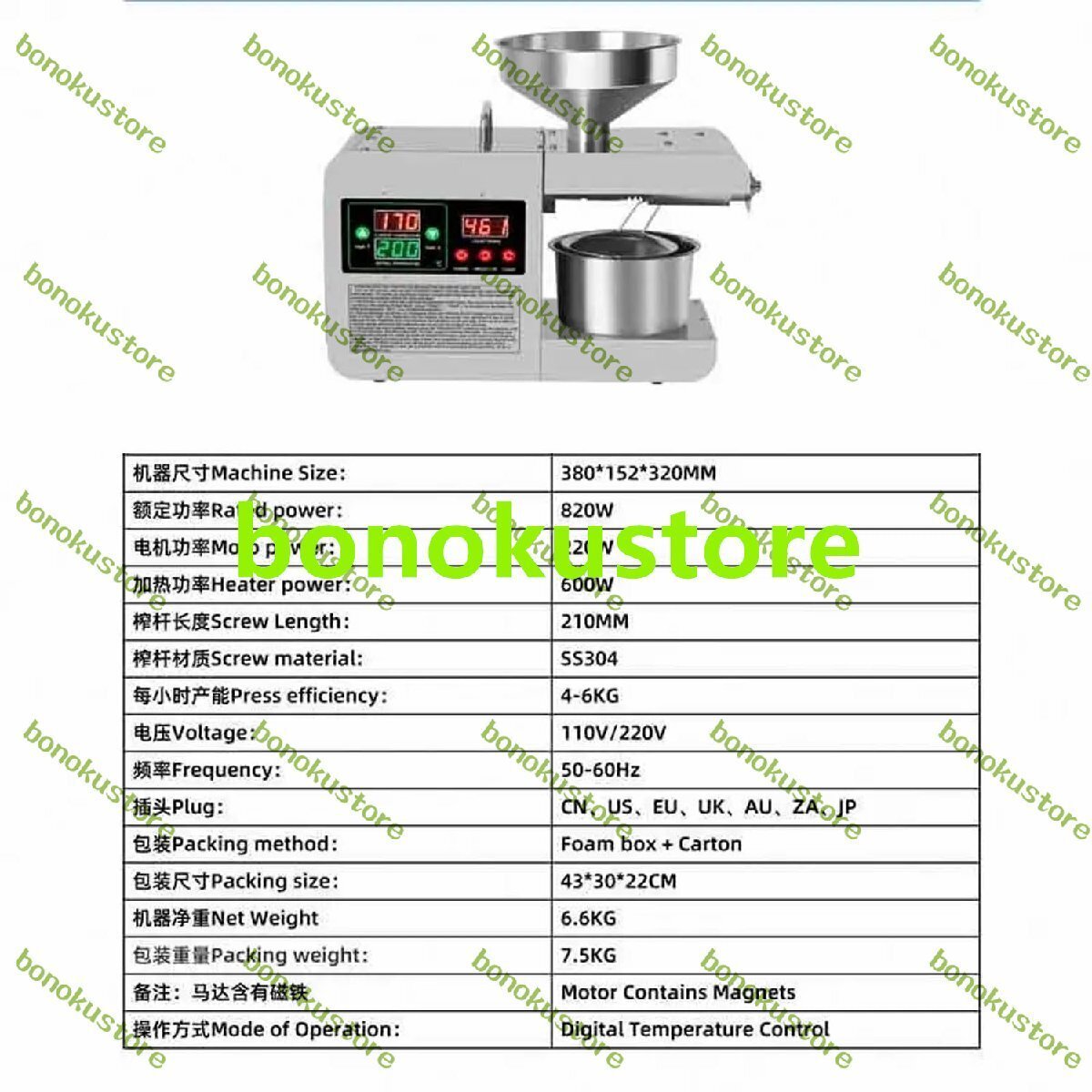 名前: デスクトップオイルプレス 主な材質:ステンレス鋼 電圧: 110V/220V 定格電力: 820W モーター出力: 220W 加熱電力: 600W 寸法: 380x152x320mm パッケージ: 1×オイルプレス
