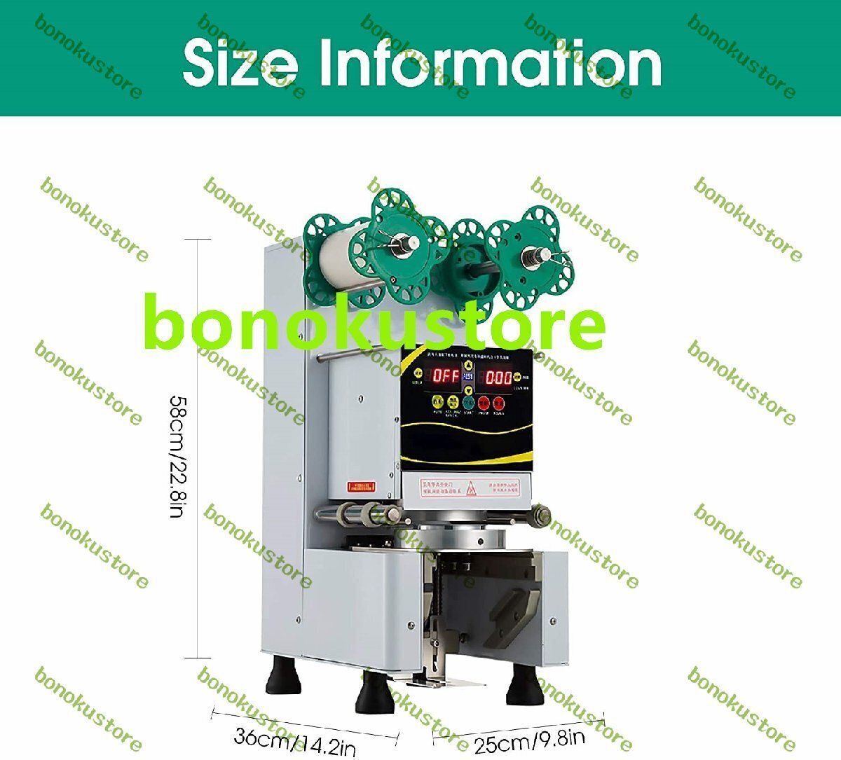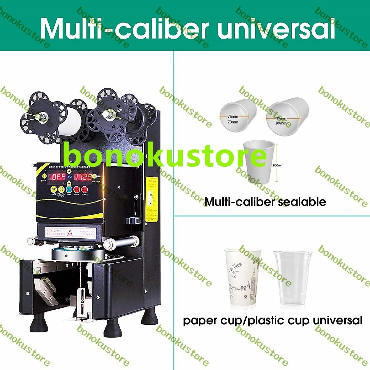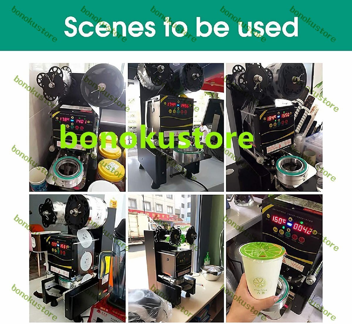 製品説明仕様製品名:全自動シール機(黒/白)モデル:RC-995S材質:ステンレス鋼ドリブンタイプ:フルオート定格電圧:220V 50Hz / 110V 60Hz電力:360W出力:400-500カップ/時間シール直径:2.76 "(70mm)/2.95"(75mm)/3.46 "(88mm)/3.5"(89mm)/3.54 "(90mm)/3.74"(95mm)最大カップ高さ:7.87 "(200mm)シール速度:400-500回/時間カップ材質:PP /単層紙コップのみ(他の材質はありません)フィルム素材:PPのみ(他の素材は利用できません)温度範囲:170oC-200oC/338oF-392oF機械寸法:360x250x580(mm)パッキング寸法:490x380x670(mm)正味重量:61ポンド/ 28kgパッケージの重量:66ポンド/ 30kg特徴:1.頑丈で耐久性のあるステンレス鋼構造2.気泡膜を節約するための正確なシーリングのための高感度スキャナー3.便利な自動カップ再配置機能4.安全で便利な操作のためのインジケータライト5.数秒で自動的にシール6.カップ飲料、ボバミルクティー、アイス&ホットコーヒー、スムージーなどのシーリングに適しています。