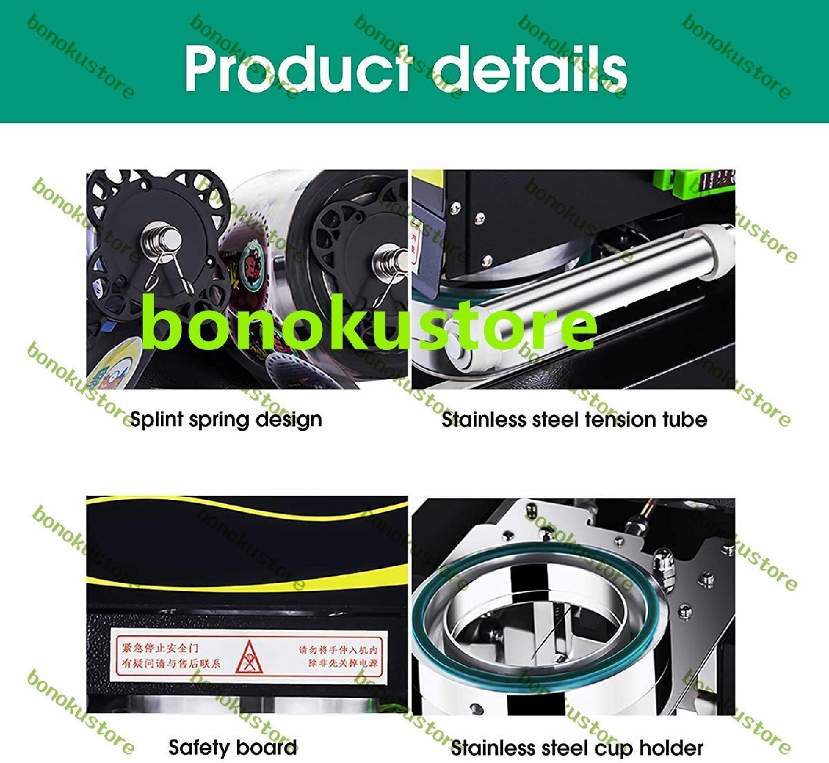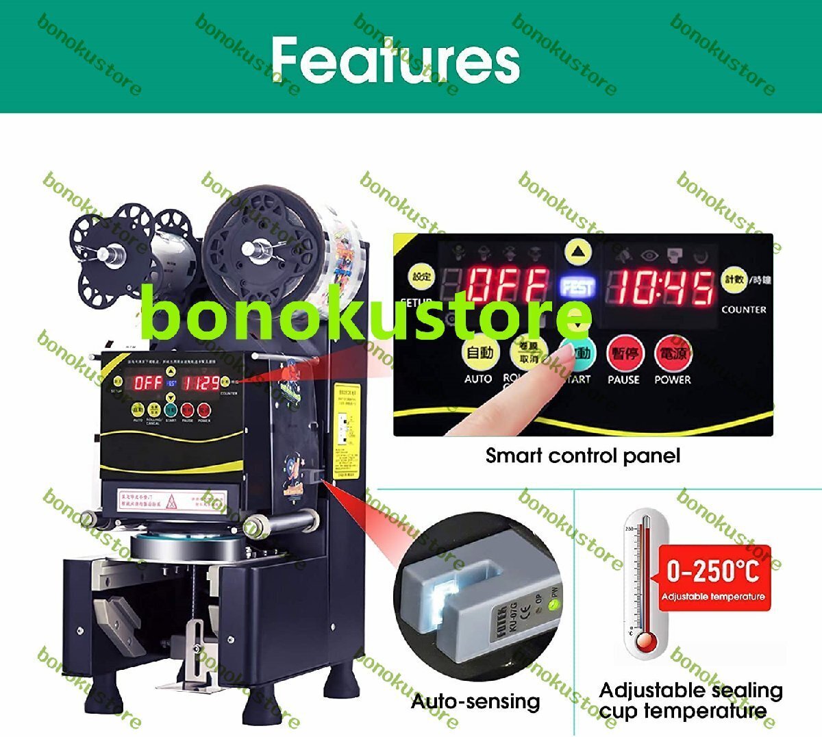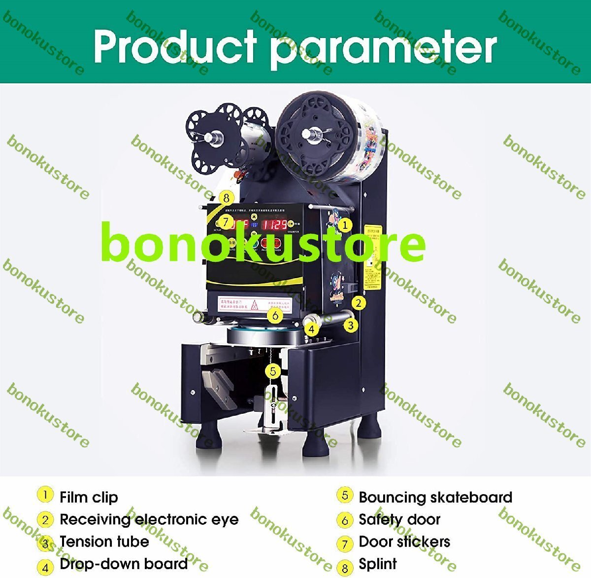 製品説明仕様製品名:全自動シール機(黒/白)モデル:RC-995S材質:ステンレス鋼ドリブンタイプ:フルオート定格電圧:220V 50Hz / 110V 60Hz電力:360W出力:400-500カップ/時間シール直径:2.76 "(70mm)/2.95"(75mm)/3.46 "(88mm)/3.5"(89mm)/3.54 "(90mm)/3.74"(95mm)最大カップ高さ:7.87 "(200mm)シール速度:400-500回/時間カップ材質:PP /単層紙コップのみ(他の材質はありません)フィルム素材:PPのみ(他の素材は利用できません)温度範囲:170oC-200oC/338oF-392oF機械寸法:360x250x580(mm)パッキング寸法:490x380x670(mm)正味重量:61ポンド/ 28kgパッケージの重量:66ポンド/ 30kg特徴:1.頑丈で耐久性のあるステンレス鋼構造2.気泡膜を節約するための正確なシーリングのための高感度スキャナー3.便利な自動カップ再配置機能4.安全で便利な操作のためのインジケータライト5.数秒で自動的にシール6.カップ飲料、ボバミルクティー、アイス&ホットコーヒー、スムージーなどのシーリングに適しています。