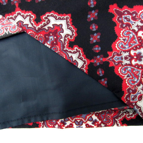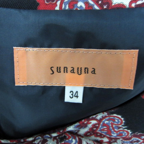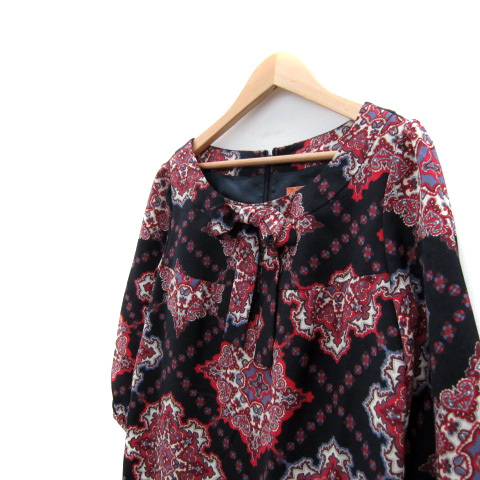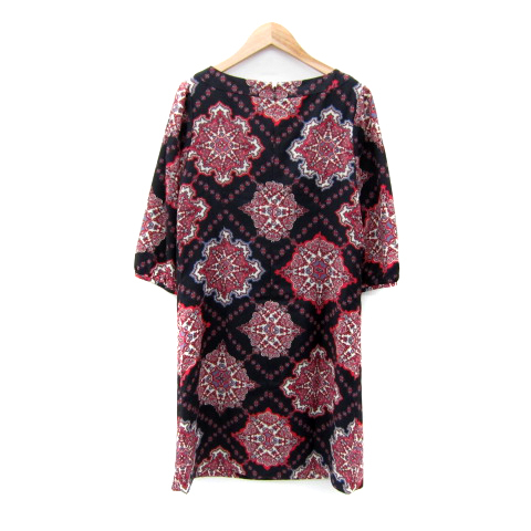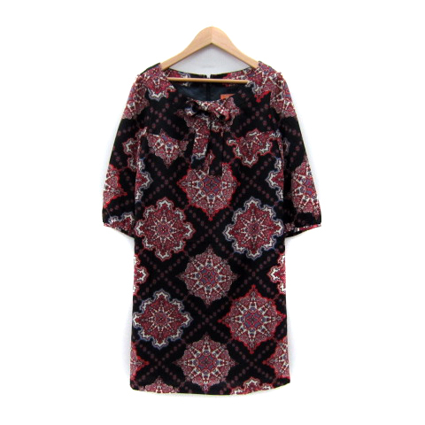 スーナウーナ Sunauna ワンピース ひざ丈 七分袖 ラウンドネック 総柄 リボン マルチカラー 34 XS 黒 赤 紫 /SY39 レディース
