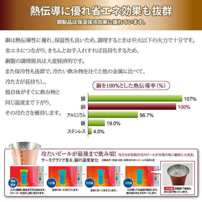 銅は鉄の5倍、ステンレスの25倍もの熱伝導率の良さを誇ります。