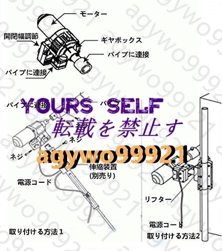 セット内容:巻上モーター*2、リフター*2、制御器*1 巻上モーター:リミットダイヤルで回転数を0-40調節、開閉幅0-4m対応。トルク100N.m、最大巻き上げるパイプの長さ110m。回転速度:2.8rpm。 制御器:AC110VコンセントとDC24Vモーターを連接、制御器にあるスイッチを操作で、高所のモーターを制御、ビニールハウスの巻上パイプの巻上、巻き下げをコントロール。 リフター:巻き上げ機の専用部品、中に自動ロック装置ある。ビニールハウスを開けたり閉じたりする時、モーターの起動より、設置したパイプに移動。 【インストール方法】高トンネル温室の1つの側面にインストールでき、通気のためにモーターを制御します。 【簡単使用】ボタンを1つ押すだけで、換気機を開閉、温室ロールアップ換気モーターのリミットスイッチを設定、2回目の設定なし。 【広く利用されている】野菜の温室、鶏の家畜の温室、花の温室、果物の温室に適しています。 注意:取付と電線連接が必要、何のご不明があれば、遠慮なく、出品者に質問してください。