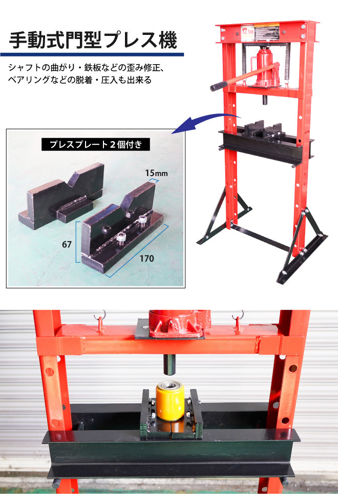 ●シャフトの曲がり修正、芯出し、プッシュ、ベアリングの脱着等にご使用ください ●手動タイプです ●プレスプレートは取り外しが可能なので、位置を変えたり取り外す事も可能です ●台座の高さを125mm間隔で6段階に調節できます ●シンプル構造なのでメンテナンスが容易 ●お客様での組み立てが必要な商品です(日本語説明書付) ※バルブを緩めすぎないでください(スチールボールが飛び出る可能性があります) ★ 取扱説明書はこちら ※ホイールベアリングブッシュ 52個セット も販売しております |