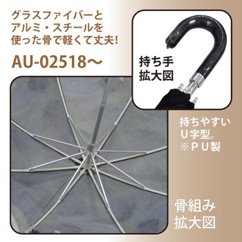 | 素材・材質 | かさ生地:ポリエステル100%(二重張り) ハンドル:PU リブ:グラスファイバー・アルミ シャフト:アルミ・スチール |