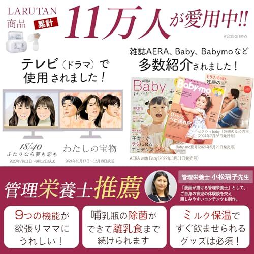 「LARUTAN ボトル ミルク ウォマ 哺乳瓶 離乳食の保温や調理 ポット 調乳 多機能 ラルタン (白)」▼4562361302903▼(商品説明)ホワイト/1個 (x 1)/N026・Color:ホワイト・1台9機能 多彩な9機能で、他社商品と比較して圧倒的に高機能です。 ミルク保温・スチム除菌・離乳食保温・急速解凍・急速加熱・タッチパネル・空焚き防止・自動停止・夜間も見やすいバックライト・ひと目でわかるクイックスタトガイド ・到着してすぐ使えるようにクイックスタトガイドが付属しています。お急ぎの場合はクイックスタトガイド、詳細は必ず説明書をご確認ください。・育児の最強アシスタント ・LARUTANボトルウォマなら赤ちゃんが泣いてすぐにミルクをあげられます。ママとパパのストレスも軽減。 授乳上手は寝不足知らず ・夜間に熱湯を沸かしたり、注いだりしなくて良いので安全です。タッチパネル、夜間も見やすいバックライトで簡単操作。・大切なお子様に、機能重視の多機能ボトルウォマを本体サイズ:幅約20cmx奥行き約14.0cmx高さ約14.5cm(カバ収納
