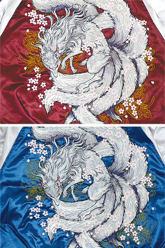 刺繍に定評のある古舗ブランド、華鳥風月の姉妹ブランド「朧」から「九尾スカジャン(9022813)」のご紹介です! カジュアルなポリエステル生地を使用し、気軽にお楽しみ頂くことの出来るスカジャンを製作しました。 今回、モチーフの主役に採用されたのは、近年人気を博している【九尾】柄。 1枚持っているだけでずっと使えるアイテムです。 | ||||||||||||||||||||