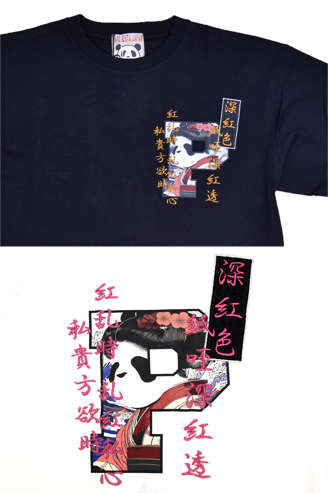 和柄ブランド【錦】の姉妹ブランドとして誕生した、お茶目なパンダをモチーフとした【PANDIESTA JAPAN】より「熊猫日本GEISHA半袖Tシャツ(585852)」のご紹介です。 今や、錦の定番モチーフとなった「錦PANDA」!! パンディエスタのオリジナルボディはクオリティが高く、繰り返し着用、洗濯していただいても型崩れしません。 夏のアイテムとして半袖Tシャツは何枚でも持っておきたいアイテムのひとつ。 今回は、まるで演歌のポスターのようなデザインを背中にダイナミックに落とし込みました。 芸者に扮したパンディエスタや周囲のロゴは刺繍、着物や背景の荒波はプリントで構成されています。 フロントのロゴがパンディエスタの頭文字である「P」の型抜きになっているところもポイントです。 | |||||||||||||||||||||||||