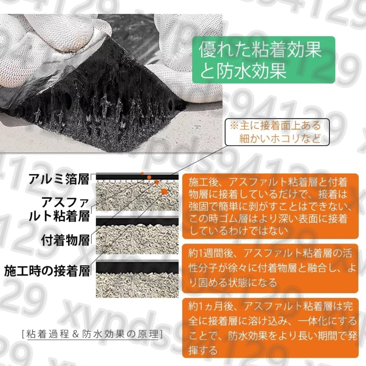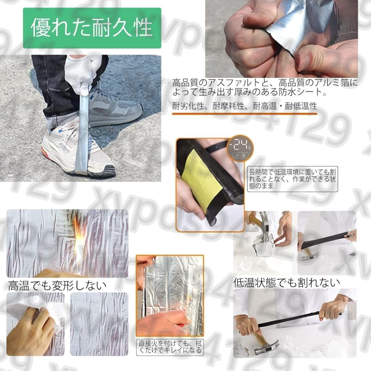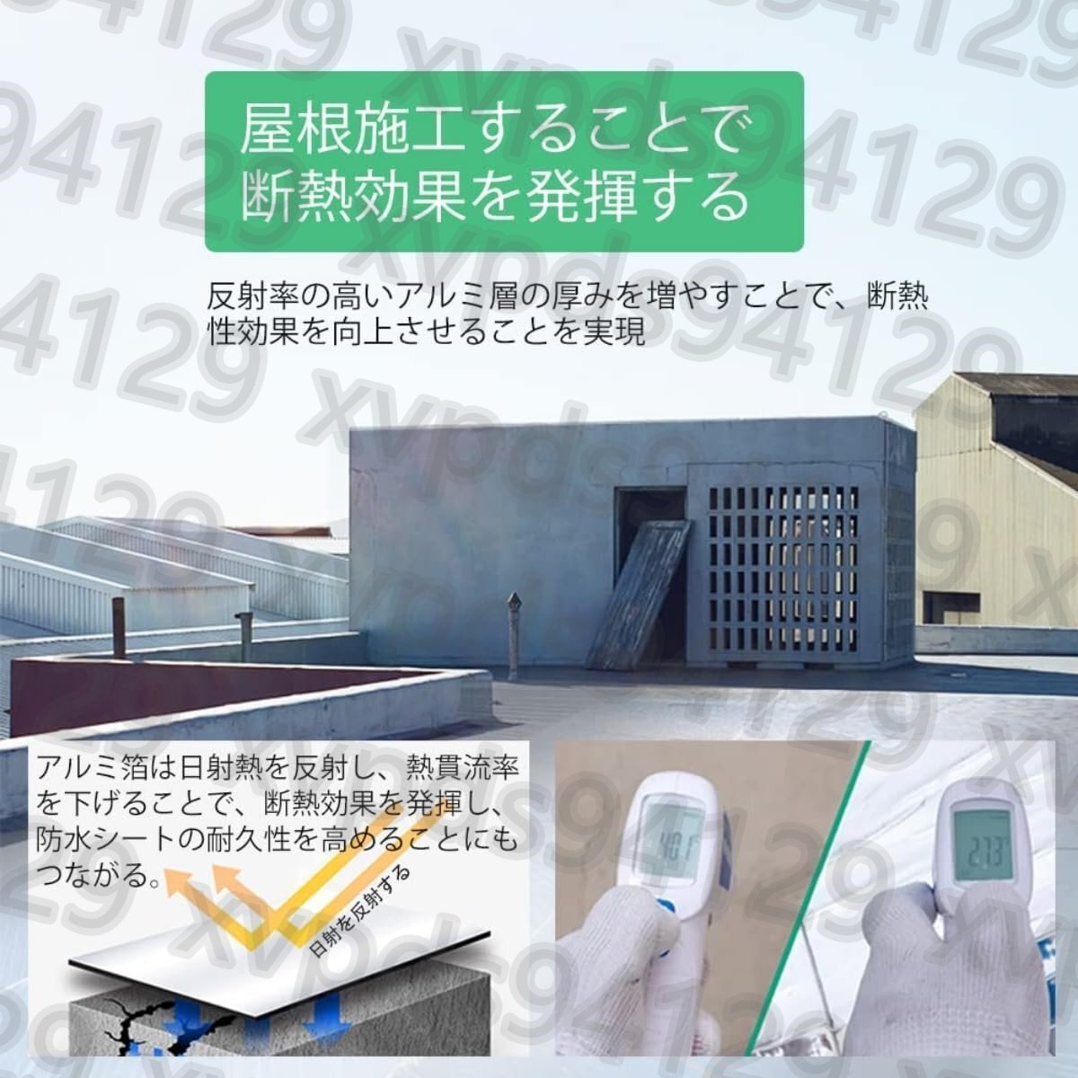 商品の説明 施工前冬など温度が低い時、正午など日差しの強い時間帯で施工することをお勧めします。※できるだけ、気温が粘着力が保てる10°C以上をお勧めします。冬など温度が低い時、日差しを1~2時間ほど浴びてことで、粘着力を高める場合があります。施工場所はほこりなどのない平面であることを確認してください。※2mm以上の隙間がある場合、充填物などで埋めてから施工してください。施工時施工?の気温は10°C以上をお勧めします。施工は上流面で行ってください。貼り付け後接着面の間に空気がないよう、しっかり押し付けてください。施工後この製品は、貼り付け時の感触では粘着性特に強いではありません。 アスファルトが徐々に浸透して表面とくっつけるには、24?36時間ほど放置し、乾燥させる必要があります。貼り付け後の粘着効果を発揮するには施工後ははがさずに静置してください。粘着効果を保つため、乾燥期間の気温も10°C以上であることをお勧めします。乾燥期間中水を避けてください。 【強力防水】良質素材,アルミフィルム、防水性、防漏性、断熱性に優れています【高温・低温耐性】高温に耐性があり、長時間の日光に当てても問題ない、低温耐に耐性があり、温度が低くても脆くならない【高強度】超延性素材を使用することで,長期間で使用しても劣化しない【簡単設置】一人で簡単に作業できます。 保護フィルムをはがして、設置場所に貼るだけで完了です【強力な接着力】接着面は強力な接着力素材を使用し、耐久性も優れていて、長期間使用でも防水性能を保てます パッケージ内容 多目的防水シート(面積が広い範囲の水漏れ対策や面積が狭い範囲の雨漏り補修に使用できます)良質なアスファルトは貼り付け後、下地の内部に浸透し、小さな穴を塞いで強力な防水効果を発揮することができます。反射率の高い厚いアルミフィルムは、優れる耐熱性と耐久性を持っているため、耐用年数が大幅に伸びます取り付けに接着剤が不要なため、簡単に取り付けることができます。 接着性能が良、水漏れの心配はありません水漏れ対策に関して長年の開発を携わって、あらゆる水漏れ問題を解決することに注力しています適用範囲:屋根のひび割れ、石積み屋根、サンルーム、窓辺のコーナー、パイプシール、トラックの荷台など 優れた耐久性高品質の材料とボリュウームアップしたデザインにより、十分なじん性を持ち、貼付け後荒れた天気でもひび割れにくく、防水効果を保てる 高い耐摩耗性厚みのあるアルミ箔を使用することで、製品の耐摩耗性と耐劣化性が効果的に向上します。 高温耐性直接火を付けても、燃やすことなく、アルミ箔層も変形しない 高効率反射フィルムアルミ箔は日射熱を反射し、熱貫流率を下げることで、断熱効果を発揮し、防水シートの耐久性を高めることにもつながる。