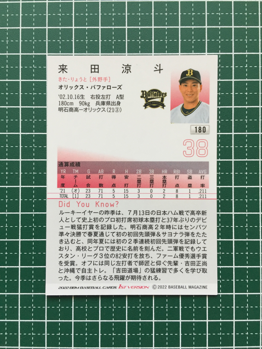 ★BBM 2022 プロ野球 1st バージョン #180 来田涼斗[オリックス・バファローズ]レギュラーカード★