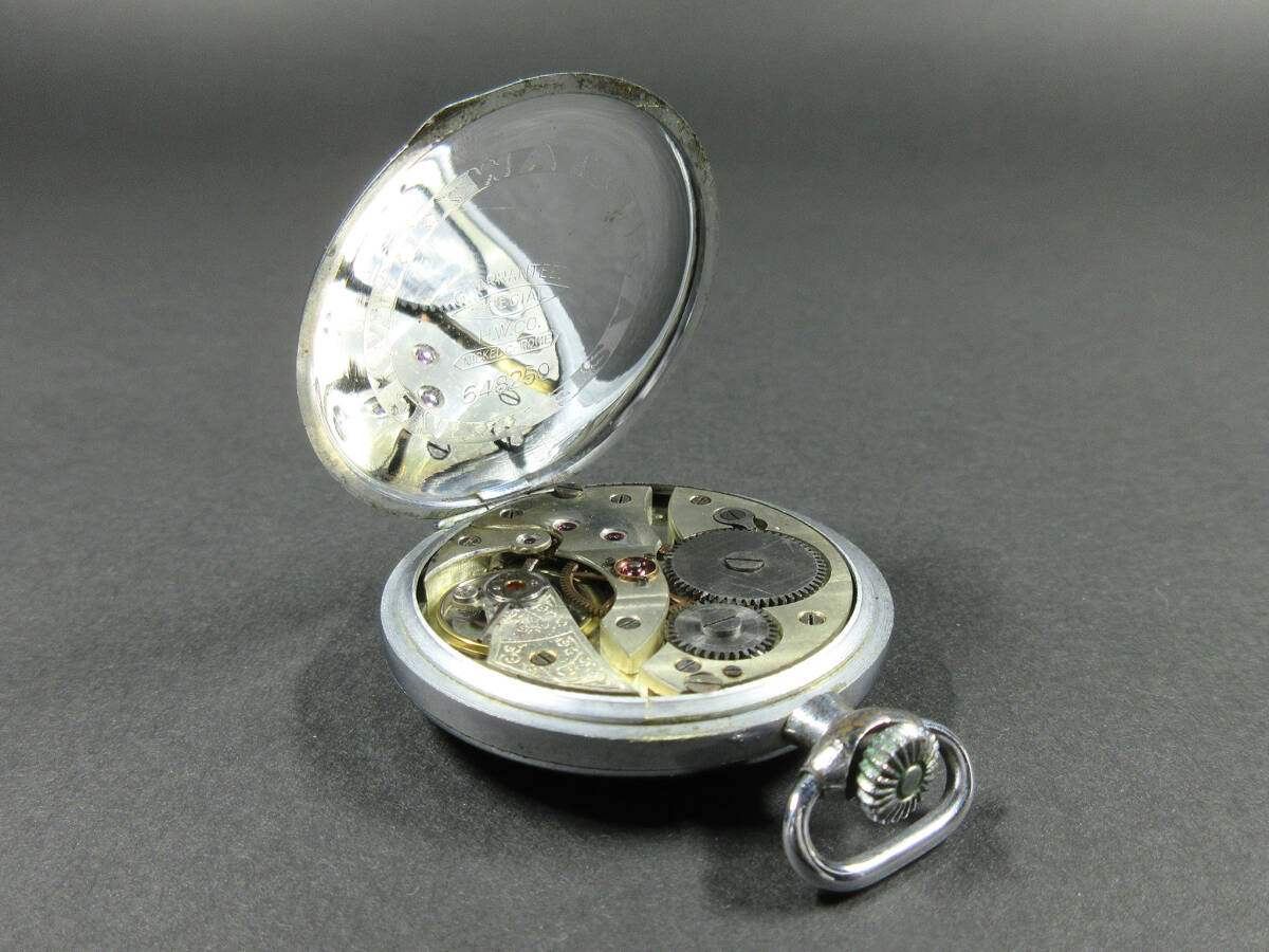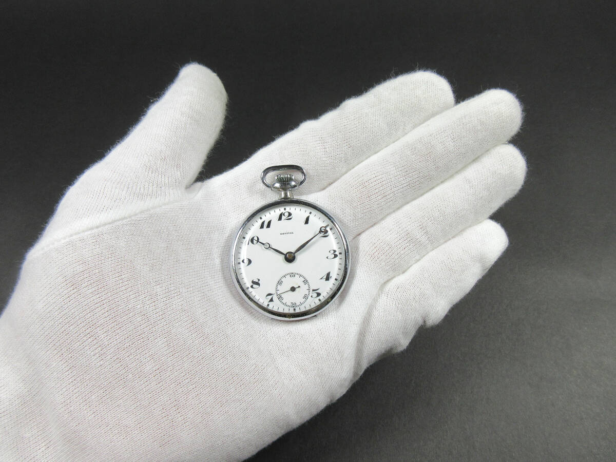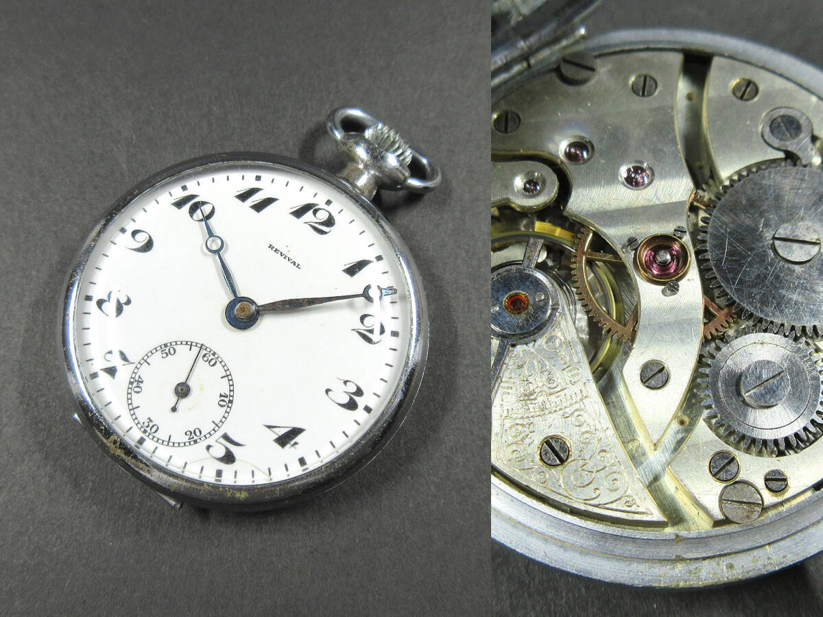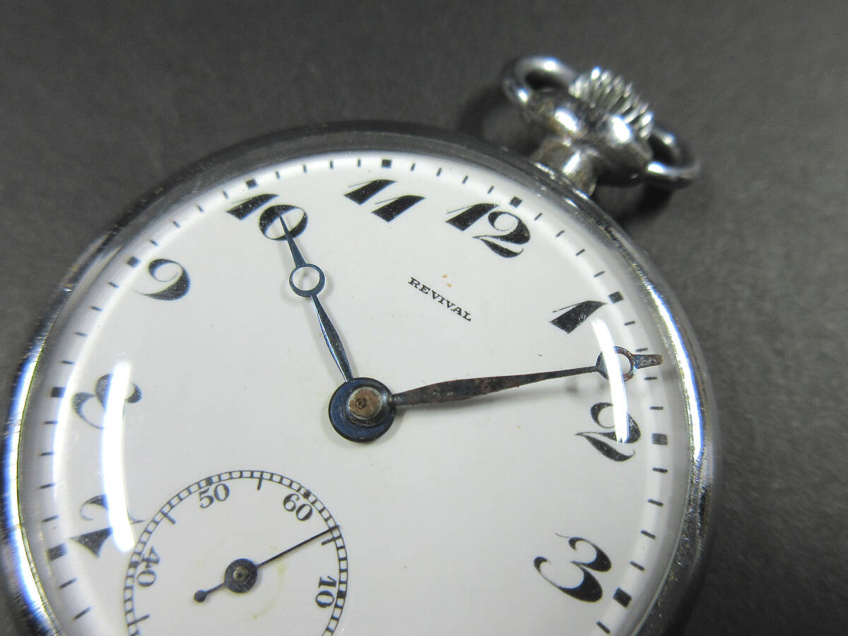 | REVIVAL リバイバル アンティーク 39mm オープンフェイス ホワイトポーセリン アラビア ニッケルケース 手巻 懐中時計 スイス製 | ||||||