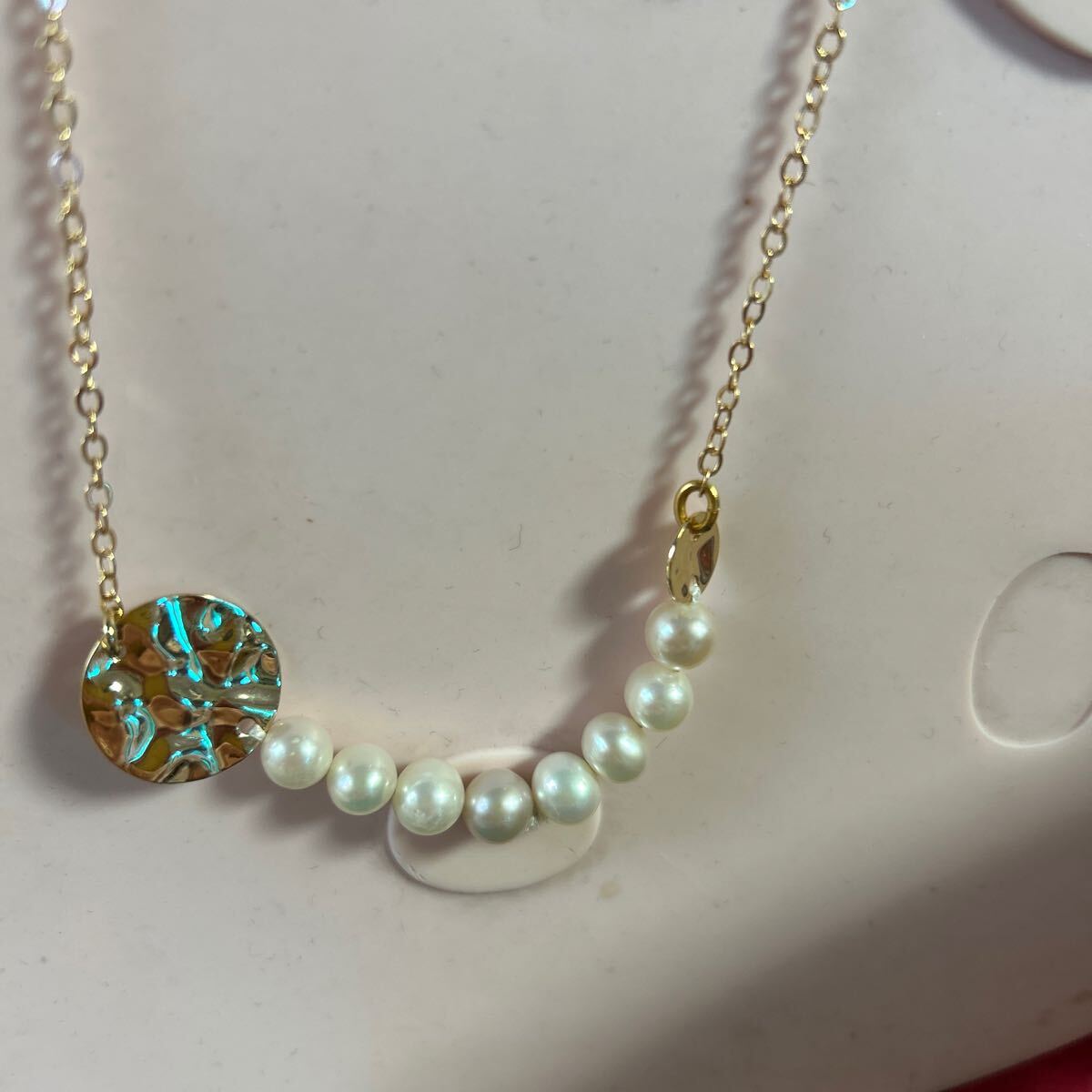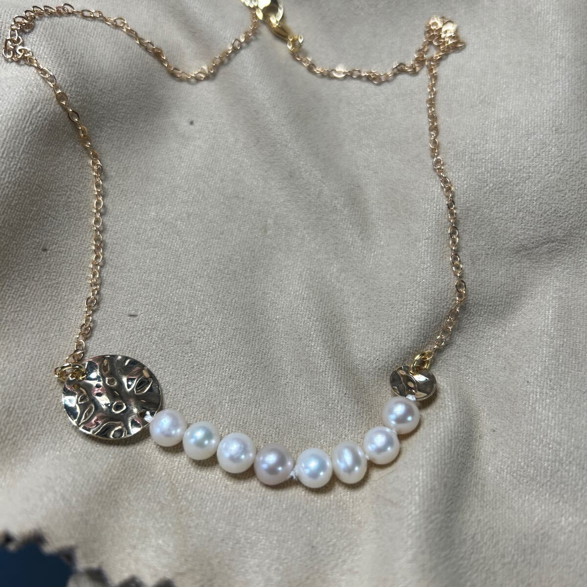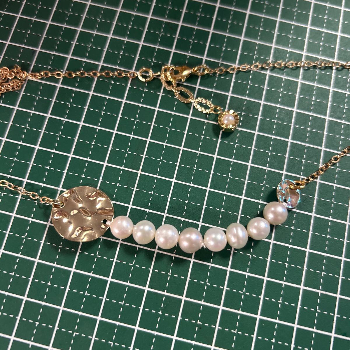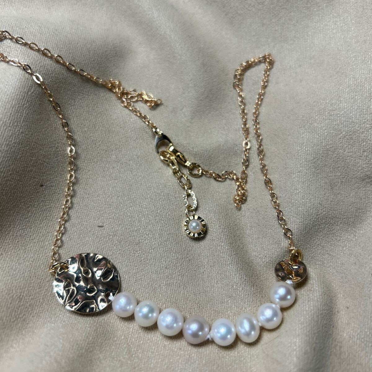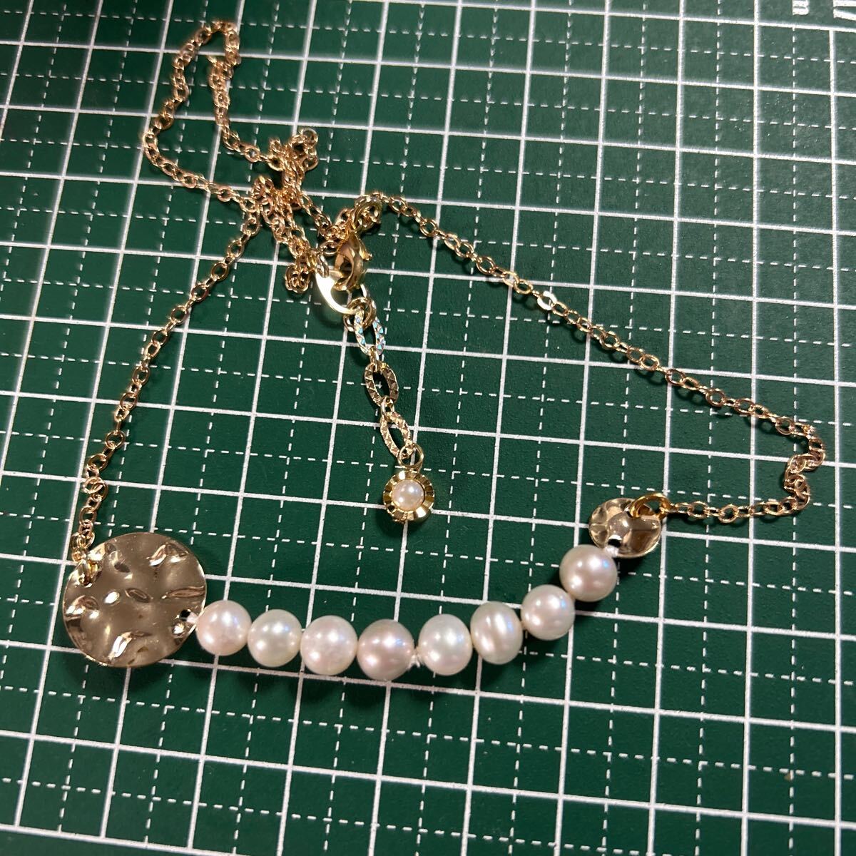6.5ミリ前後の淡水パール使用しております。天然ですので傷凹みあります。18金メッキのチェーンです。胸元が大変可愛いく見えます。頑丈な糸で真珠を繋いであるので糸のほつれが少し目立ちますのでお気になさらない方の入札をお待ちしております。アジャスターの部分についてる小さな真珠はアコヤ真珠使用してます。