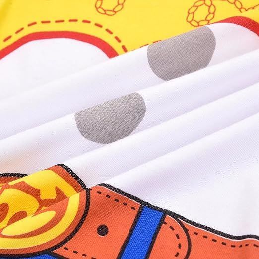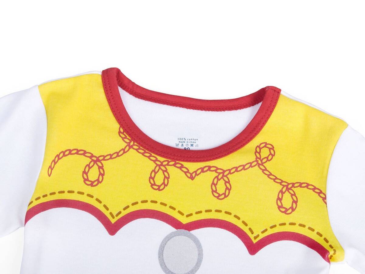 大人気「トイストーリー」のジェシーをモチーフにした可愛いキッズパジャマの上下セットです!トップスは黄色いヨーク部分に赤いパイピングとロープ柄のステッチ、白い胴体部分にはボタン、オレンジ色のベルトとバックル、青いパンツ部分のデザインでジェシーの衣装を忠実に再現しています。パンツは牛柄の白黒ショートパンツで、トイストーリーの世界観を楽しめる一着です。