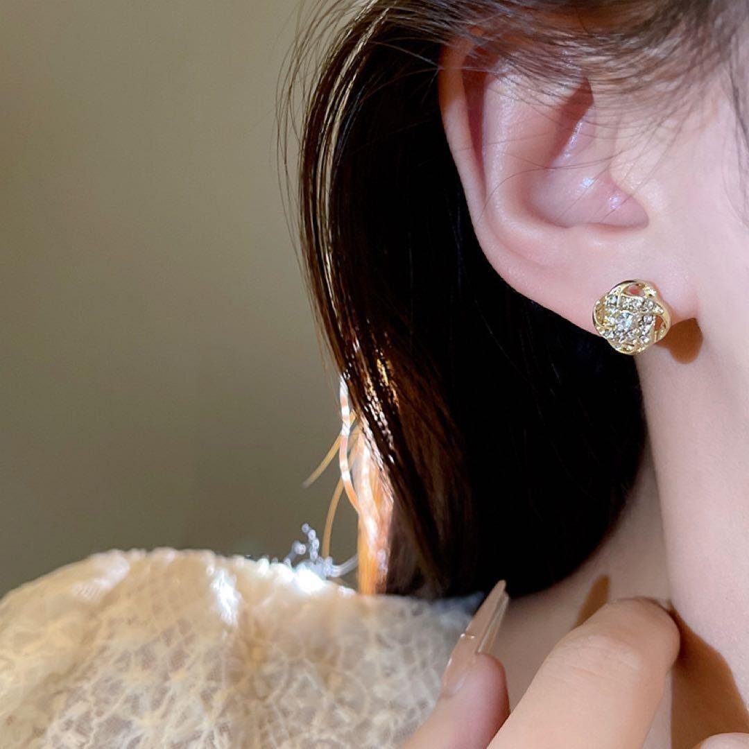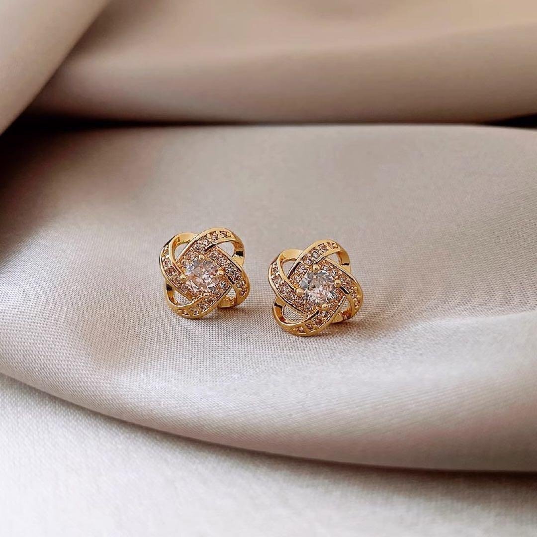 ゴールドのクローバー型ピアス、クリスタル装飾で華やかさを演出。