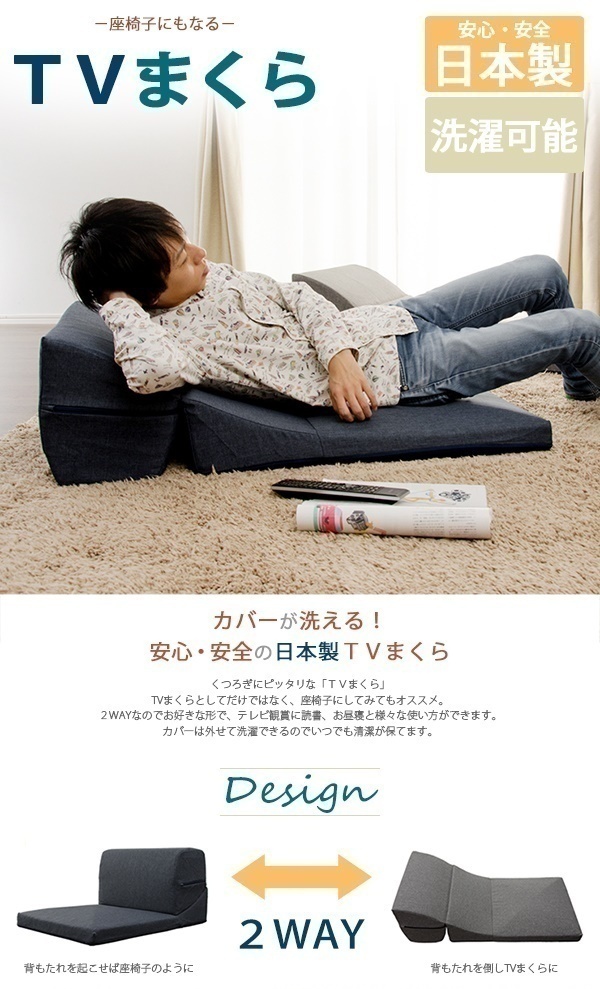 | 商品説明 | カバーが洗える安心の「TVまくら」 【仕様】 ■サイズ: 約幅500×奥行750~980×高さ110~360mm ■重量: 約3.6kg ■カラー: アッシュグレー・インディゴブルー ■材質: [生地]ポリエステル100% [中材]ウレタンフォーム ■生産国: 日本 |