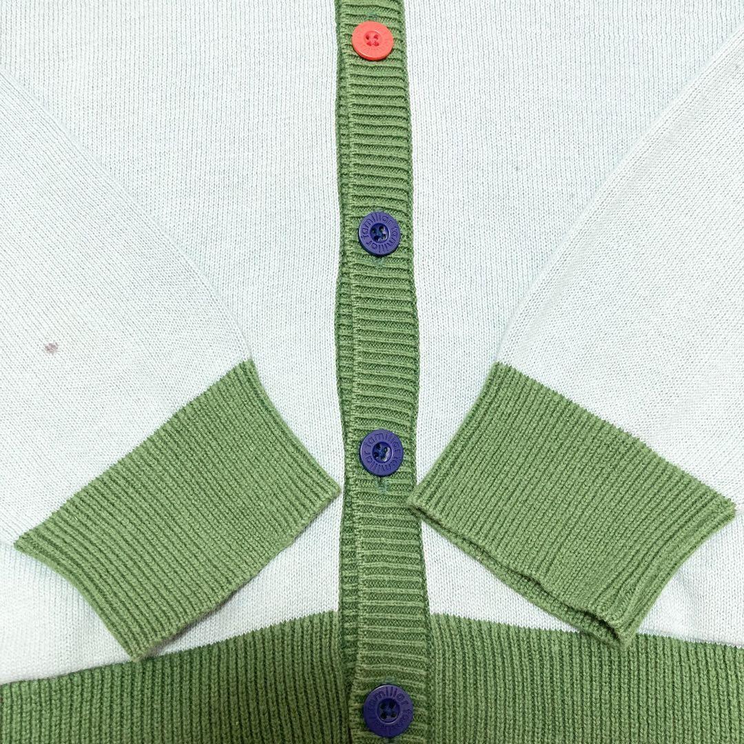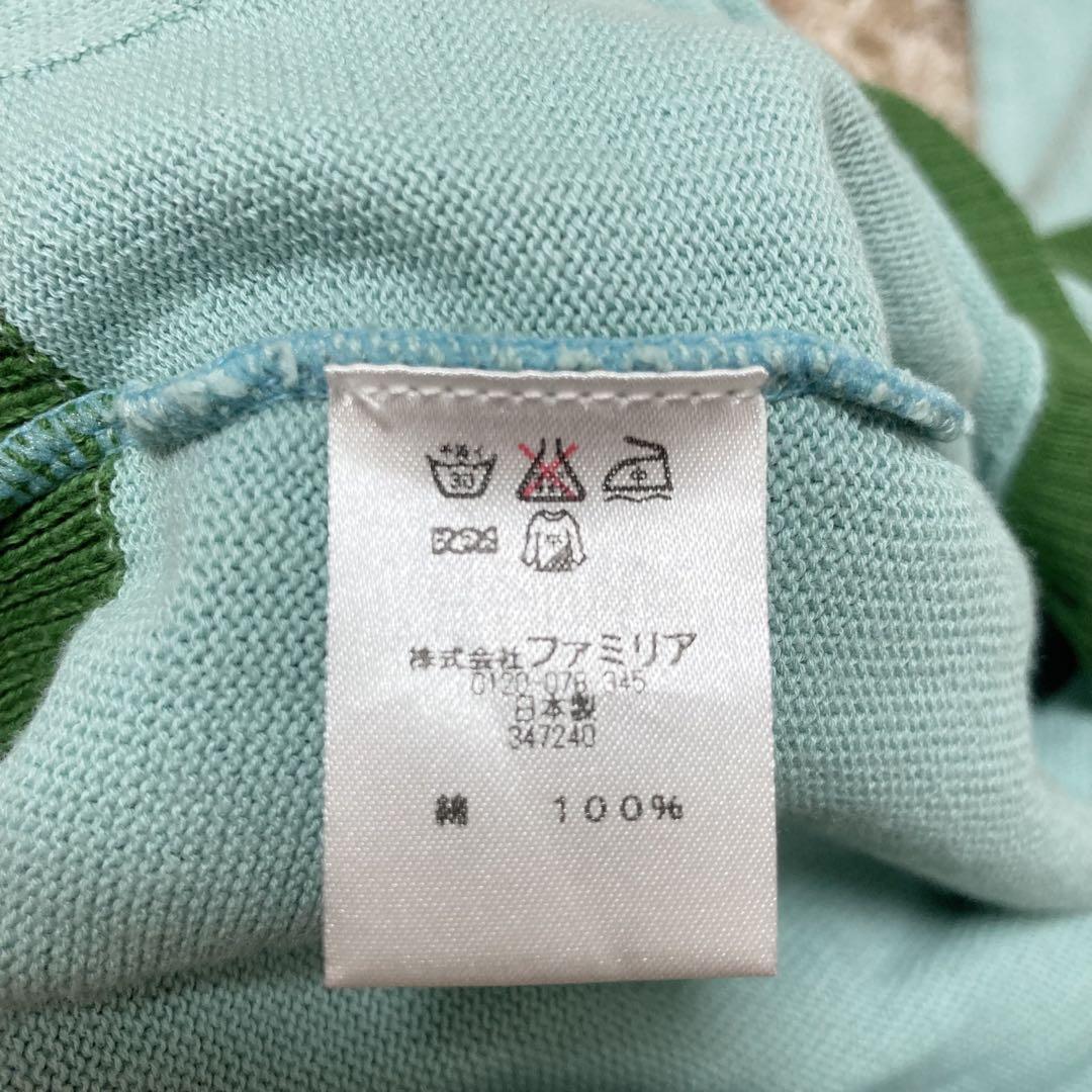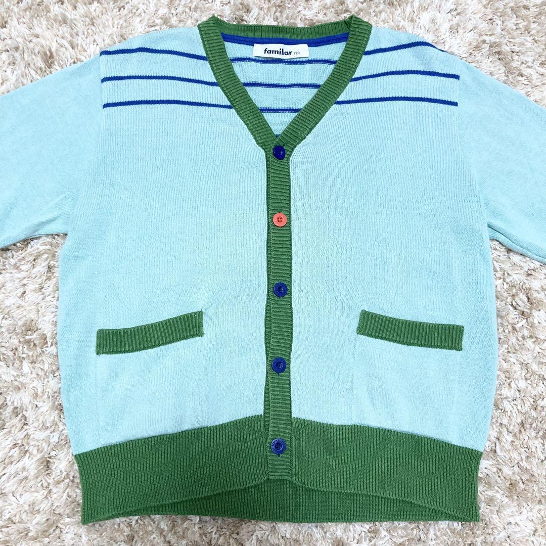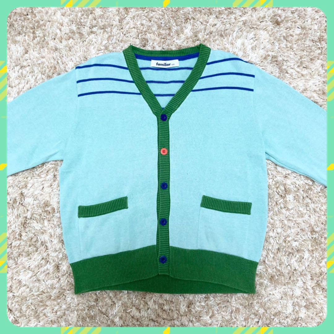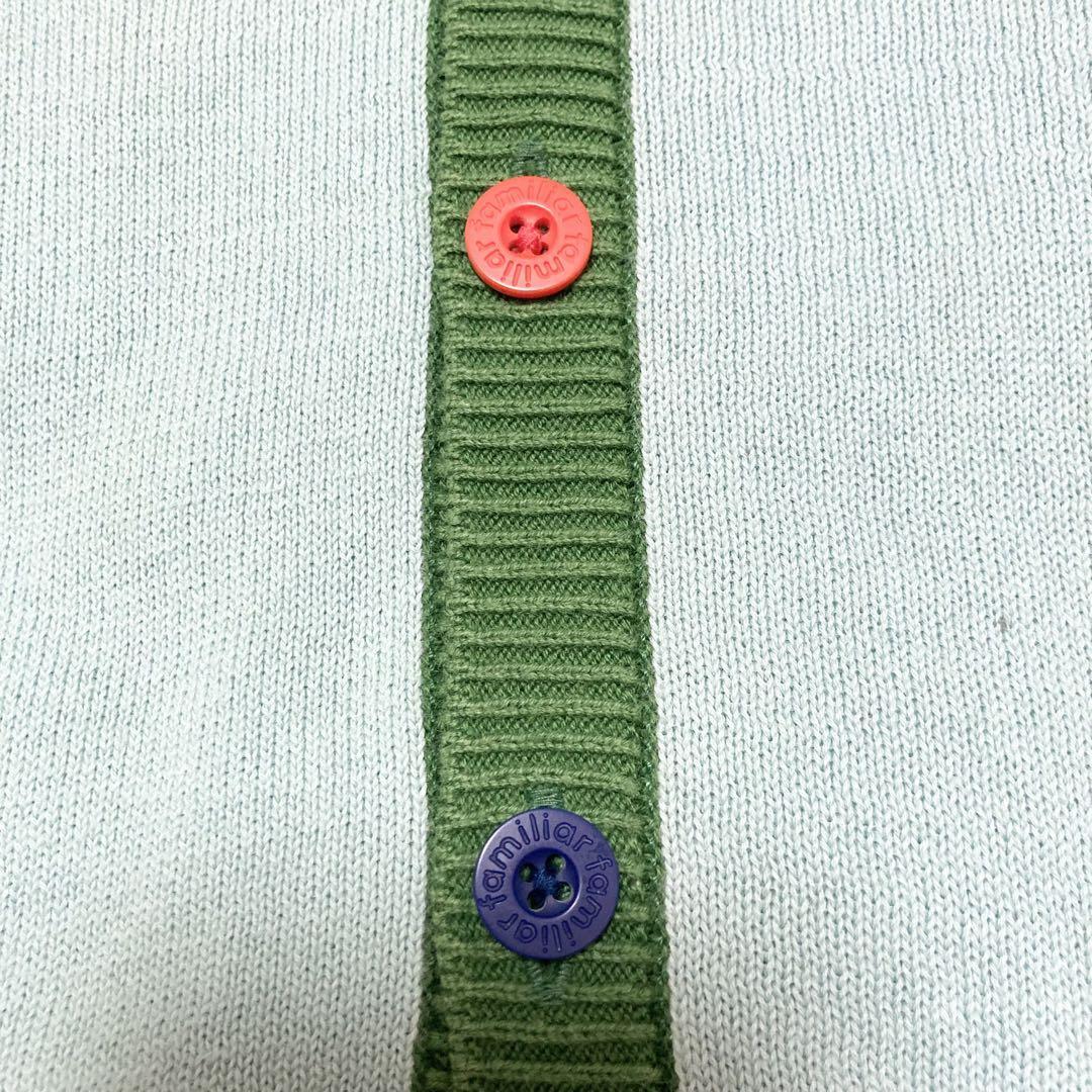 familiarのとても可愛い配色のカーディガンです。ボタンにfamiliarと書いてあります。