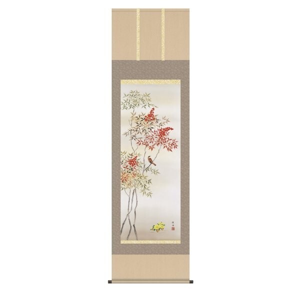 掛け軸 掛軸 純国産掛け軸 床の間 花鳥画 「南天福寿」 長江桂舟、尺五、化粧箱収納 オニックス風鎮 防虫香サービス