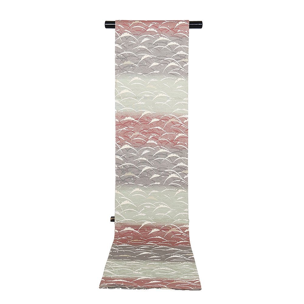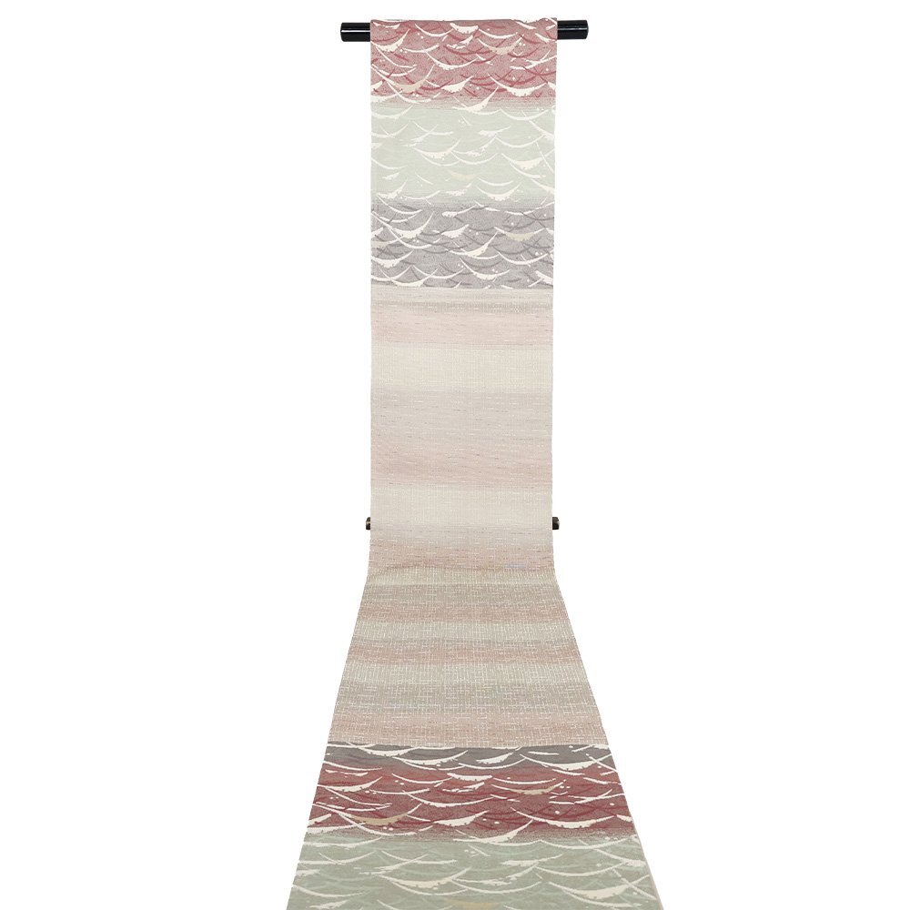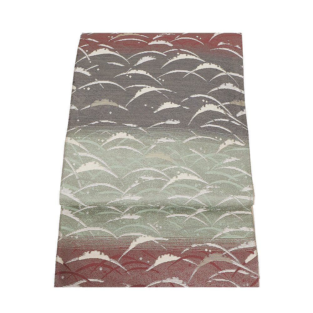 | 西陣織袋帯 赤紫・緑・薄緑・縞暈し地 露草 仕立て上がり |