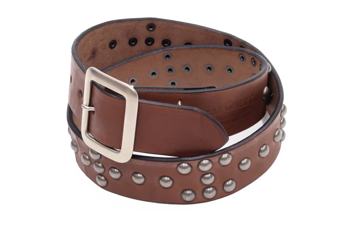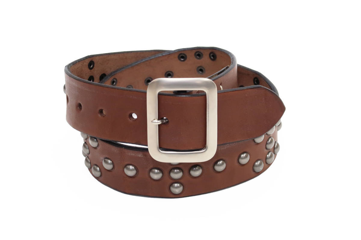 シングルピンのレザーベルトに円形ラウンドスタッズが打ち付けられたデザインです。