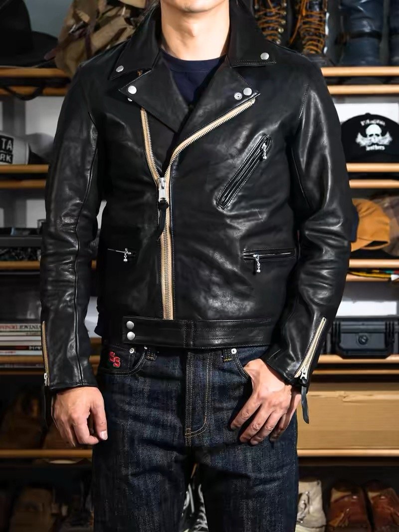 厚み約1.6mmで牛革最上級のイタリアン茶芯カーフスキンで作られた、1970年代サイクロンスタイルがモチーフのダブルライダースです。