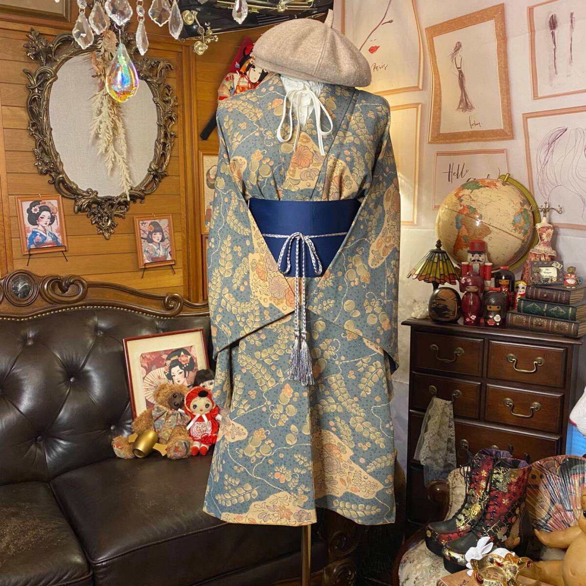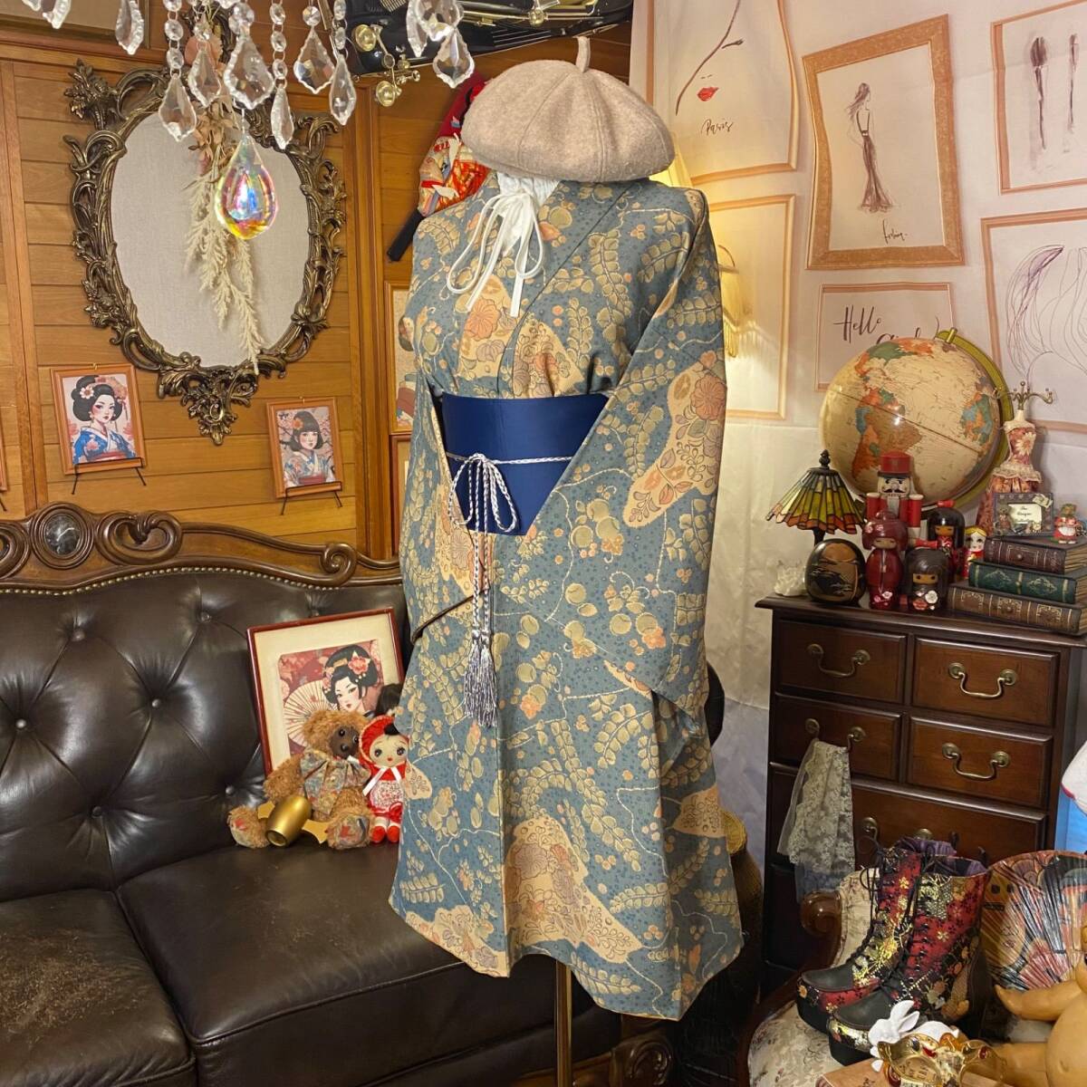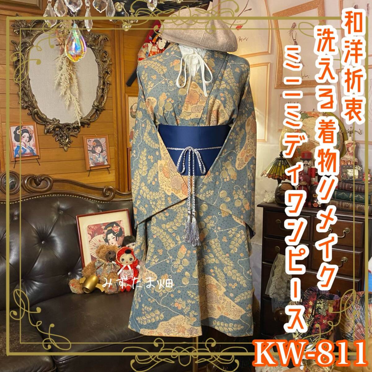 【着物 リメイク ミニミディ ワンピース ドレス 洗える 化繊 帯サッシュベルト 和洋折衷 レトロ 古着 ハンドメイド 深みのあるくすみブルーの地に、霞のように広がる淡いベージュのぼかし模様と辻ヶ花 KW-811】