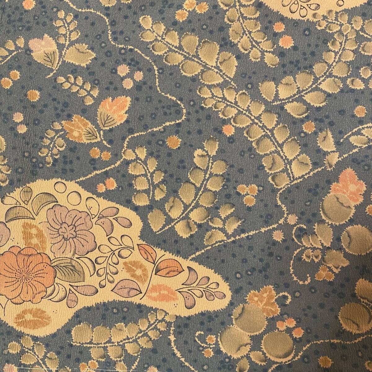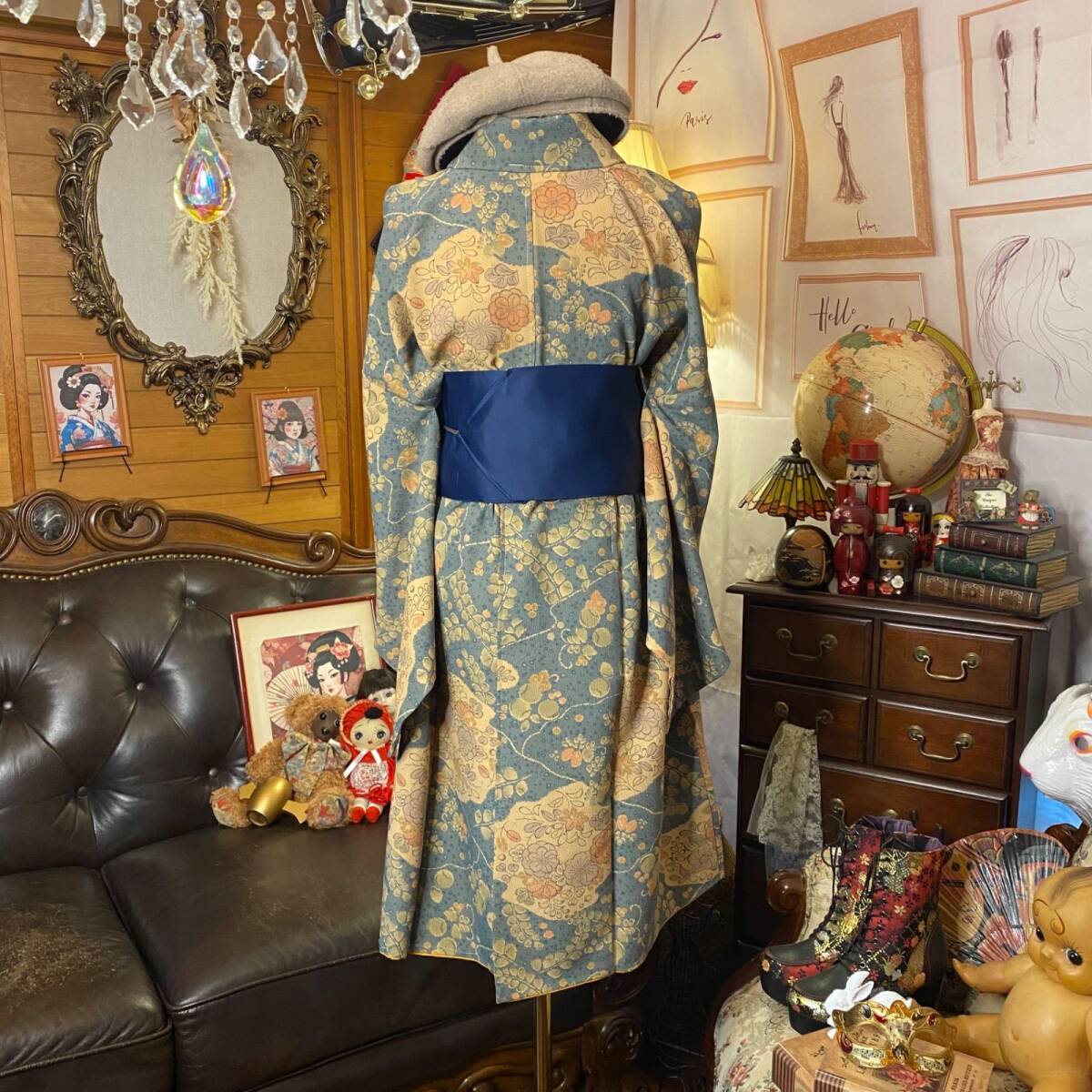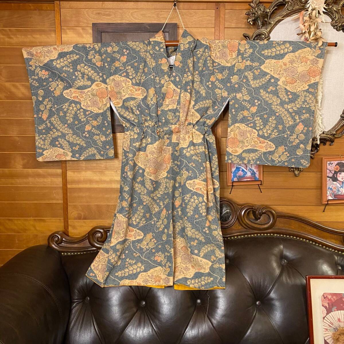 【着物 リメイク ミニミディ ワンピース ドレス 洗える 化繊 帯サッシュベルト 和洋折衷 レトロ 古着 ハンドメイド 深みのあるくすみブルーの地に、霞のように広がる淡いベージュのぼかし模様と辻ヶ花 KW-811】