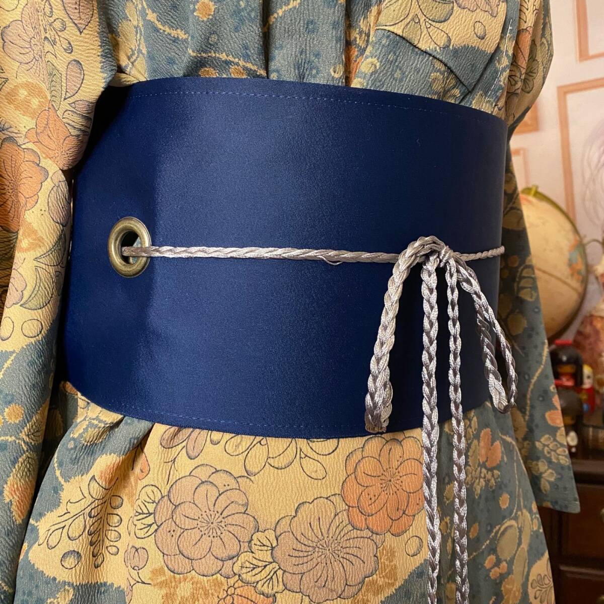 着崩れ防止、強度を持たせるために太めのウエストゴムを使用しております。また、お着物の形を最大限に活用した特性上、ウエスト部分の布が厚くなっています。付属の帯ベルト等を装着するとお写真の様に目立ちません。