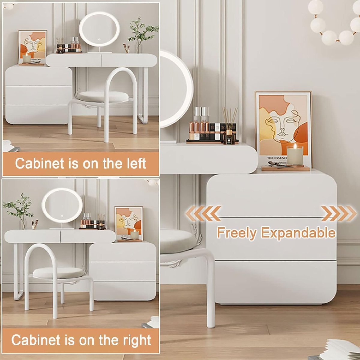 ユニークなスタイルのデザインには、化粧台、明るさ調節可能なミラー、クッション付きのスツールが付属しています。 洗面台には広々とした引き出しが 2 つあり、必要な洗面化粧台の必需品やジュエリーを収納できます。
