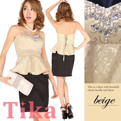 TOP部分はうっすら光沢でアラベスク柄がプリントされており、高級感のあるデザインのぺプラムミニドレス♪