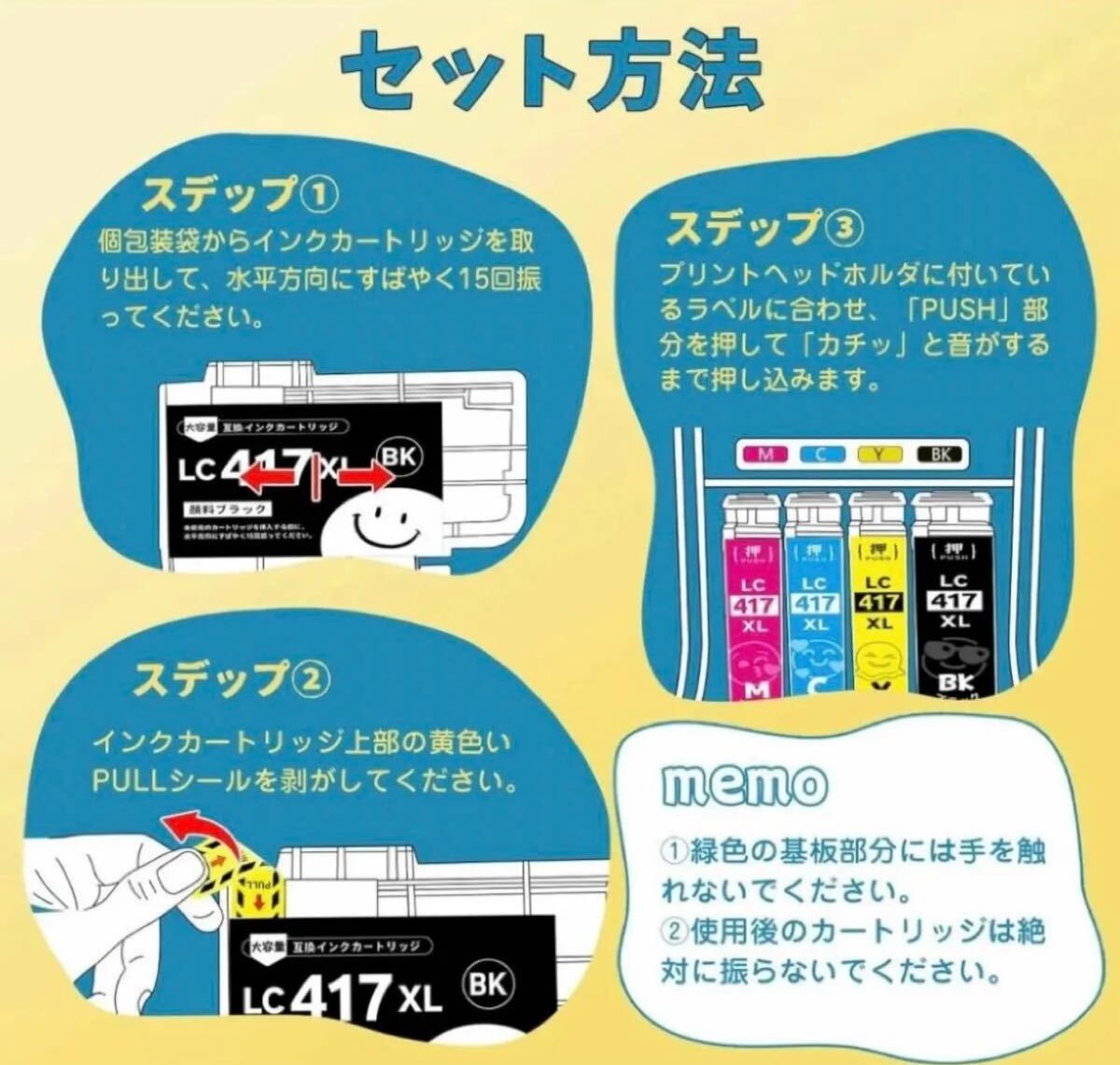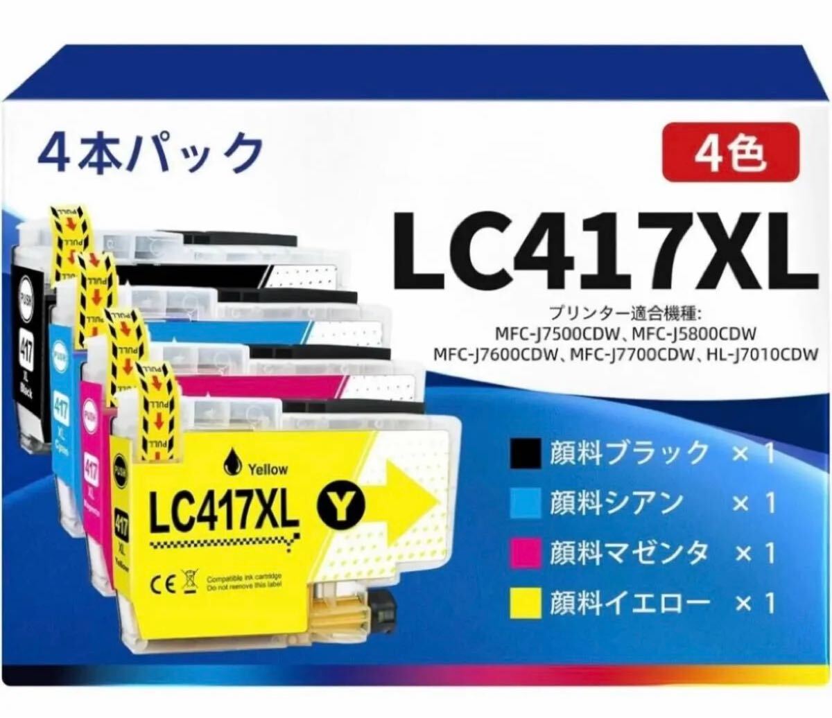 ■商品内容■ 『純正と同じ全色顔料』 LC417XL-4PK 4色パック LC417XLBK(ブラック) LC417XLC(シアン) LC417XLM(マゼンタ) LC417XLY(イエロー) 各1本 総計4本 使い捨て手袋付き ※印刷可能枚数はブラック約6,000枚、シアン/マゼンタ/イエロー約5,000枚です。(A4用紙に5%の印字密度で連続印刷した場合の参考値)