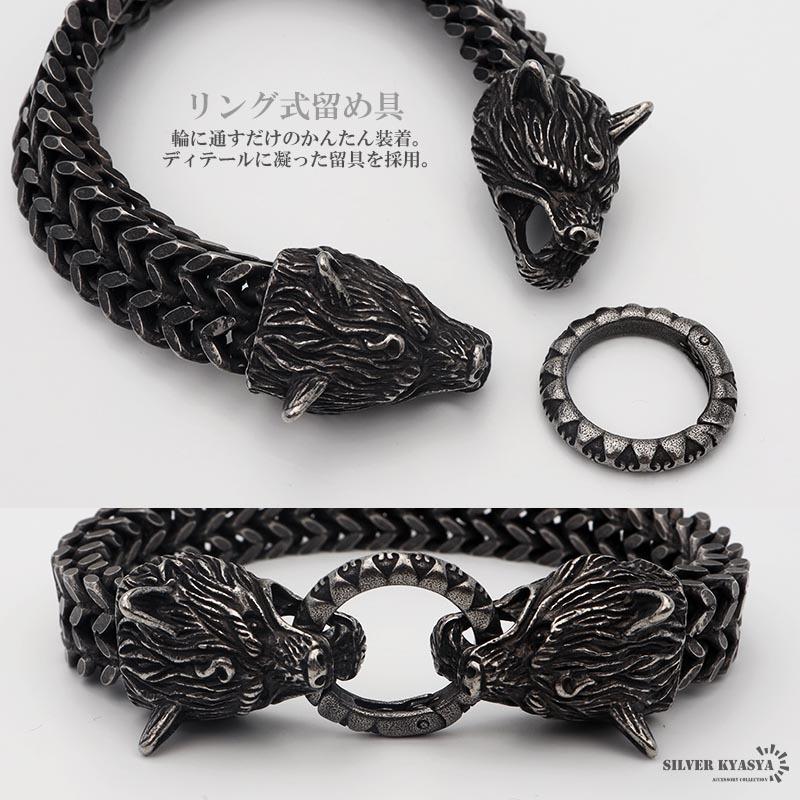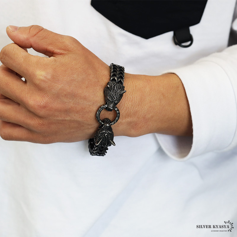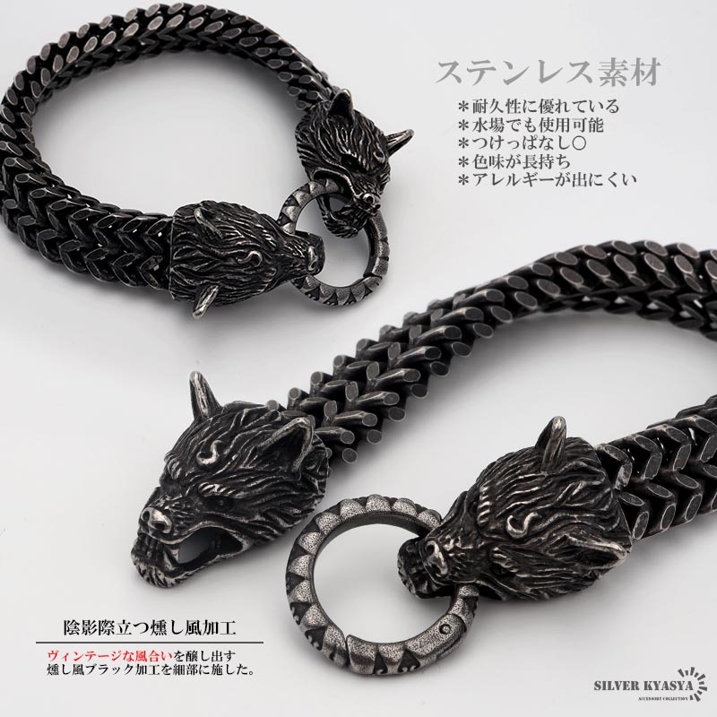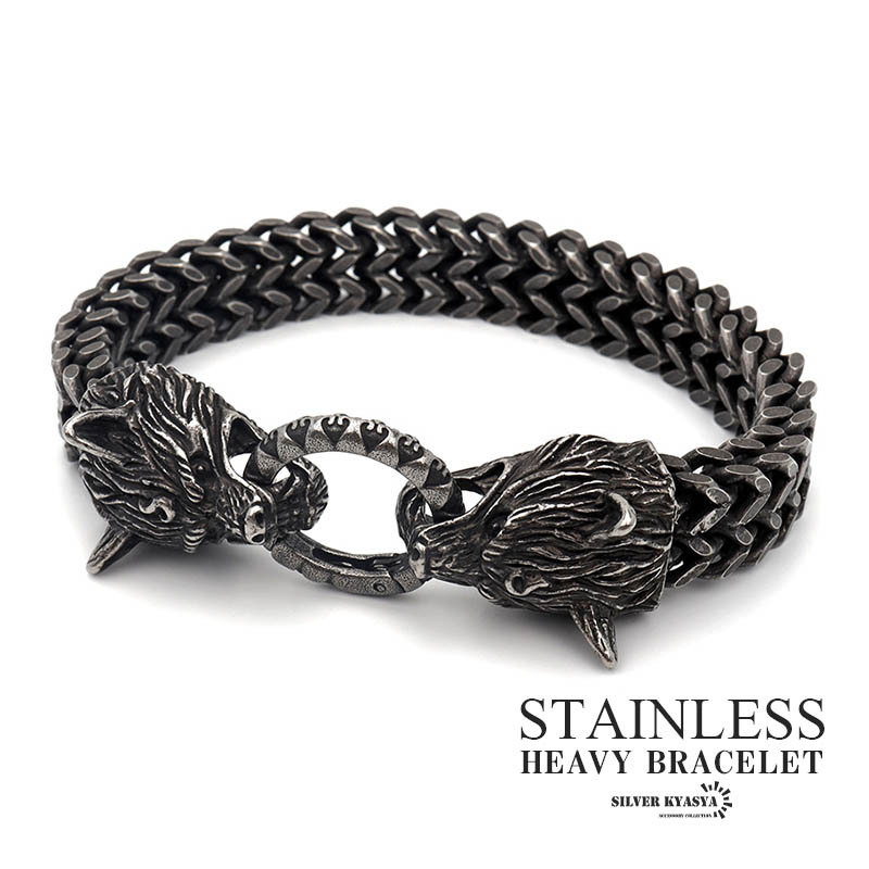 ウルフ ブレスレット ステンレス メンズ 2連 フランコブレスレット ブラック 燻 重厚 狼 ブレスレット 金属アレルギー対応