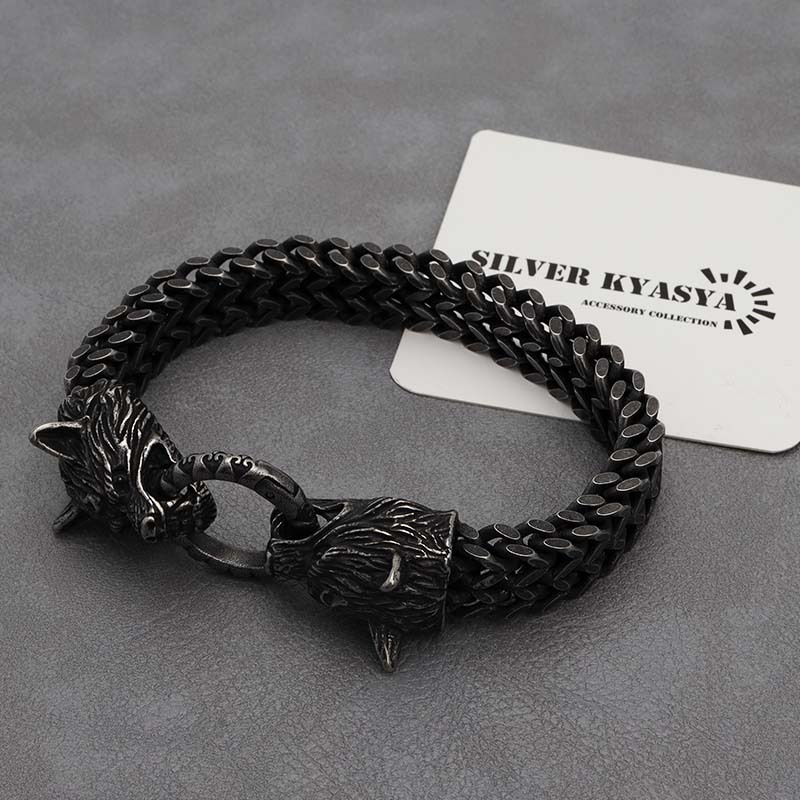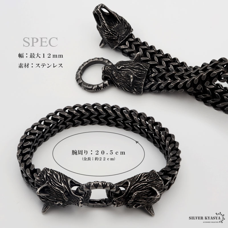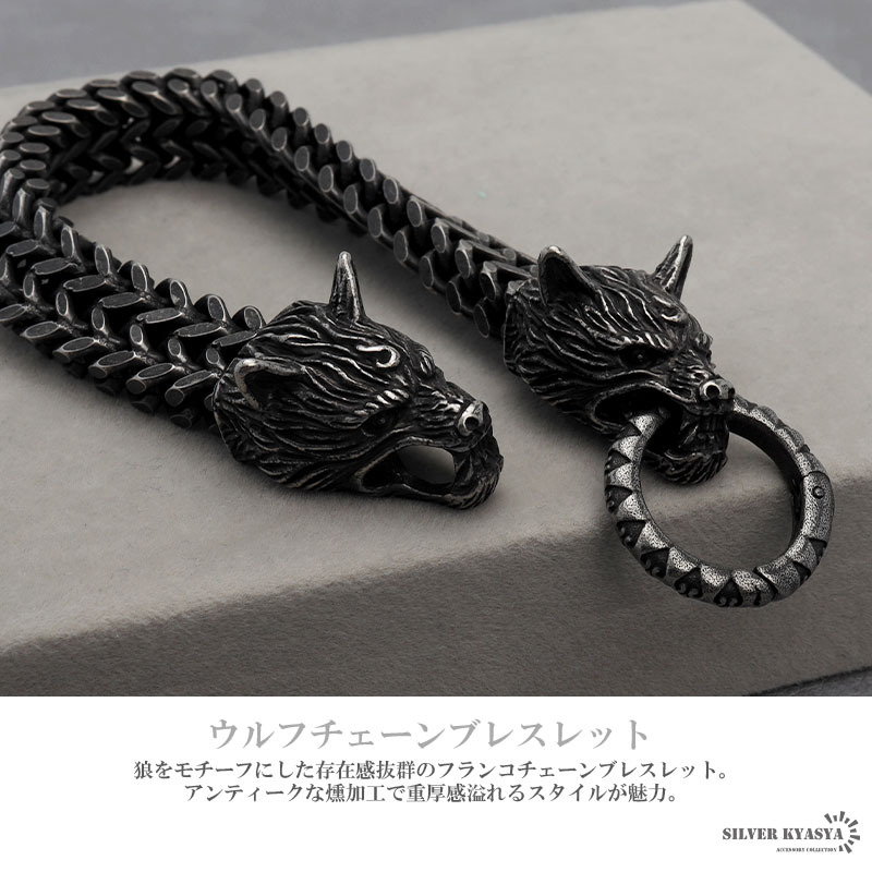 狼をモチーフにした存在感抜群のフランコチェーンブレスレット。アンティークな燻加工で重厚感溢れるスタイルが魅力。
