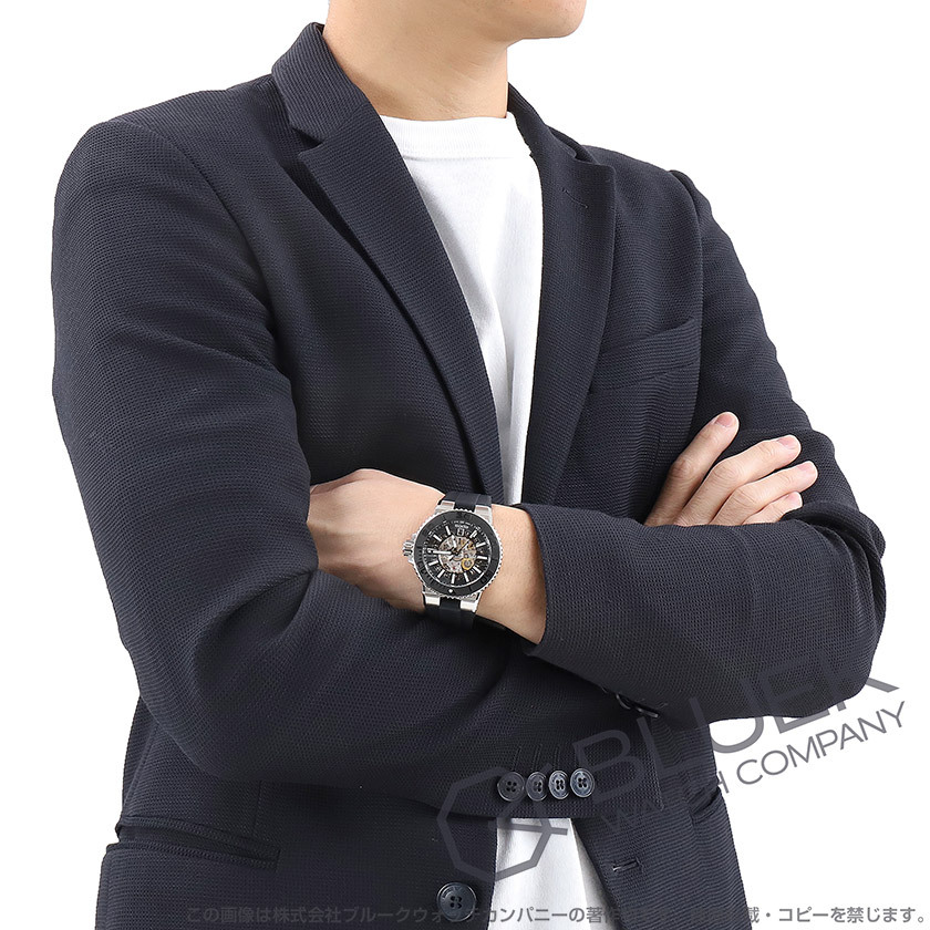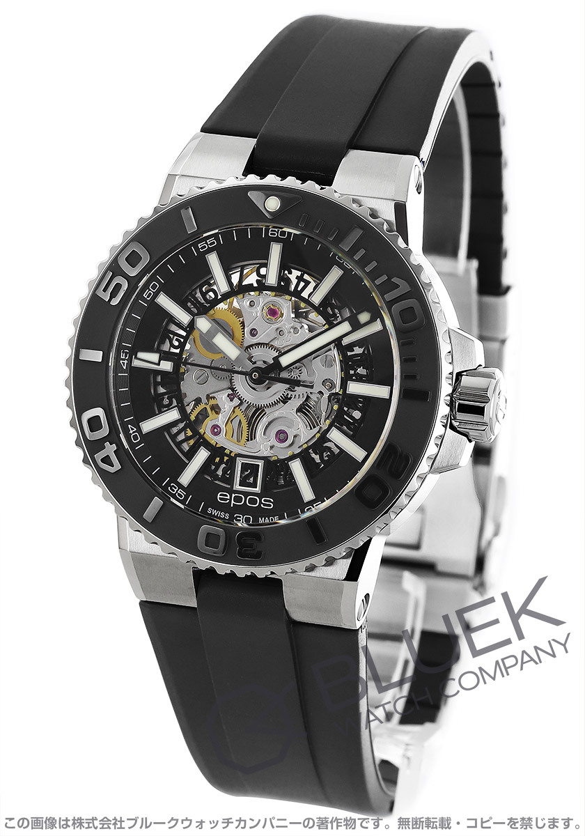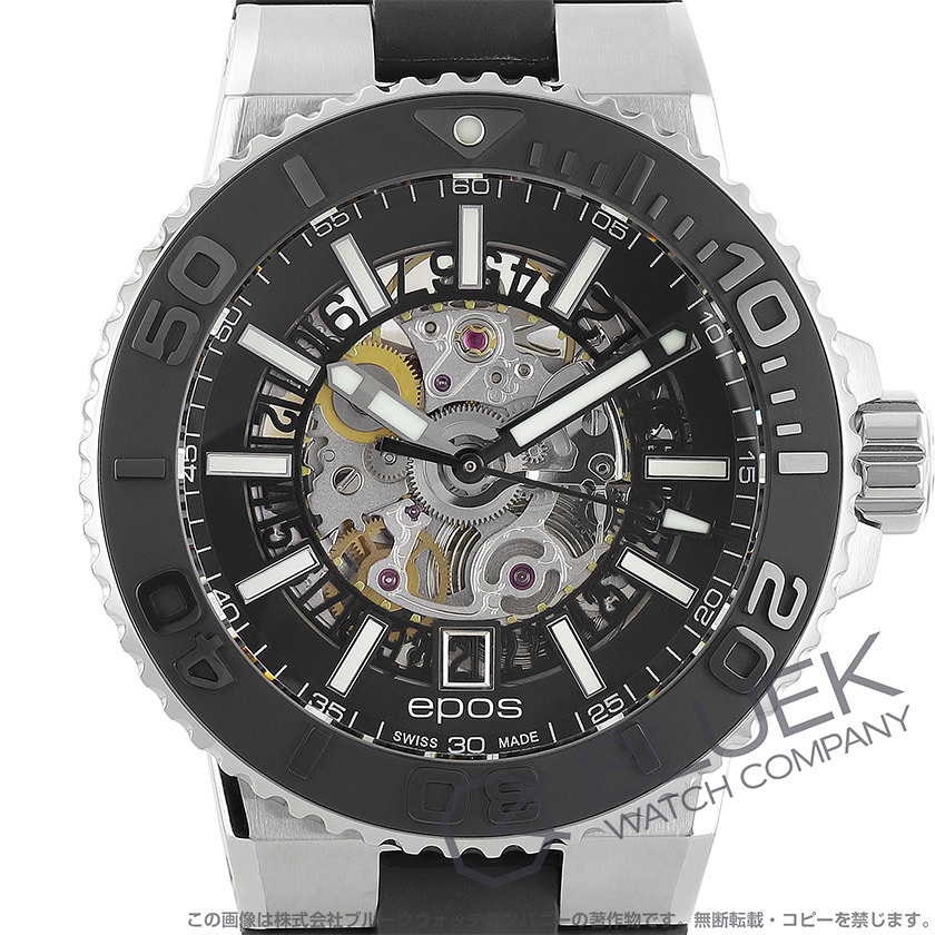 厚さ14ミリの43ミリ500m防水ケースに丸みを帯びた風防や浮き彫りが施されたダイビングスケール付きブラックベゼル、自動エスケープバルブを備えたスポーティブスケルトンは、ダイヤルから機械の内部構造を覗くエポス人気のダイバーズモデル。無駄を削ぎ落とした自動巻きムーブメントを搭載して6時の窓にデイトディスクから続く日付を表示します。中でも外周にも段差をつけた立体構造ダイヤルとブラックカラーにホワイト立体インデックス引き立つこのモデルは、ブラックラバーベルトも魅力。手元を引き締めるスポーティなデザインも格好よく、ケースバックからも機械の意匠が鑑賞できてメカ好きの目を楽しませます。 |