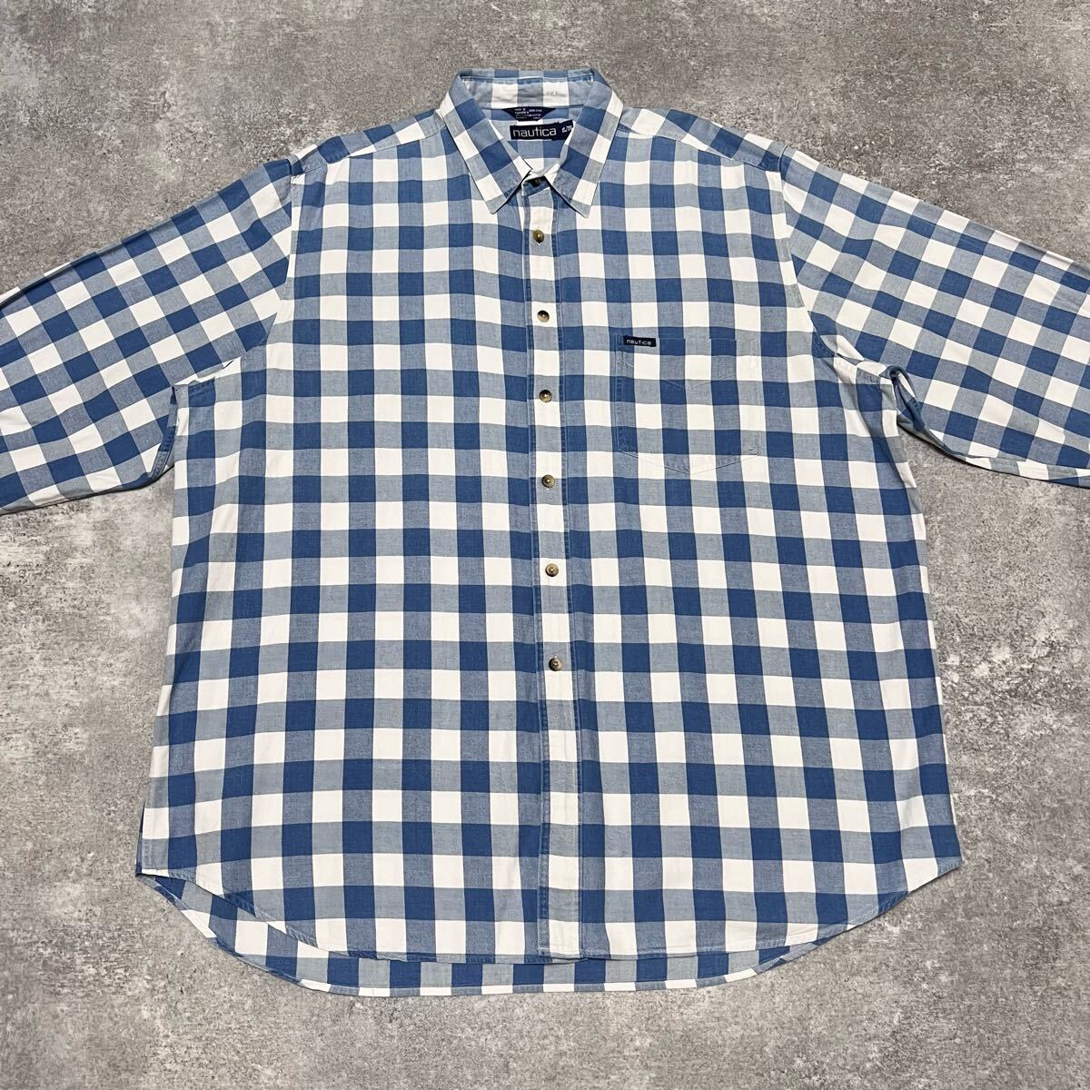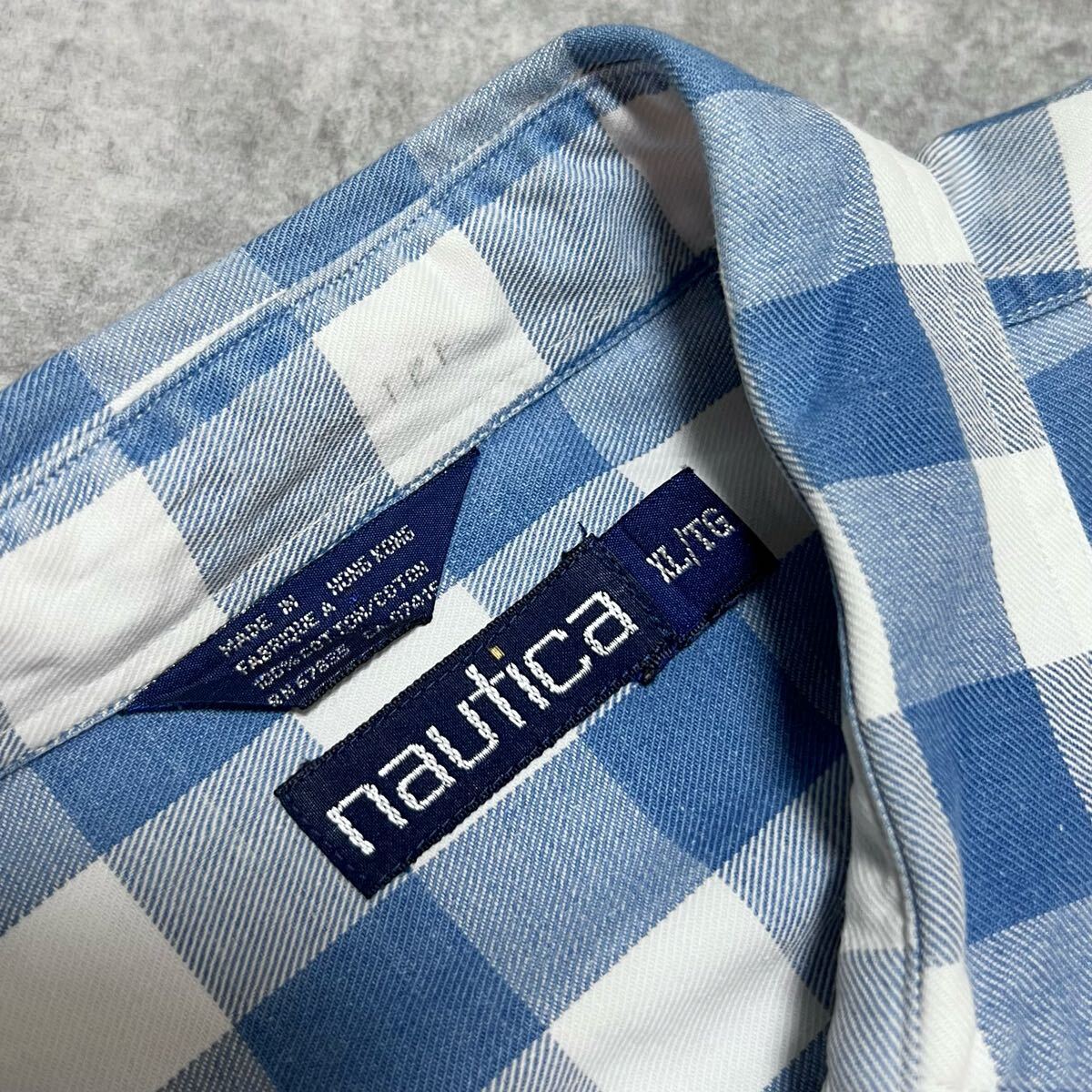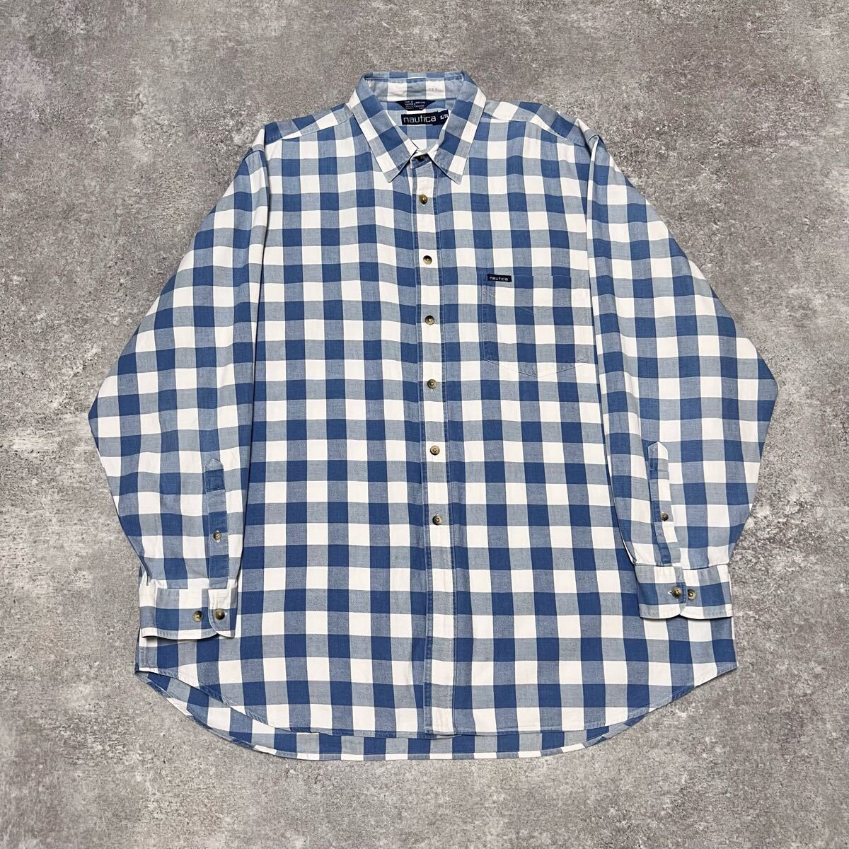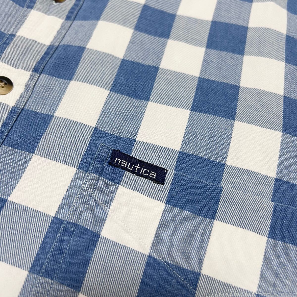 90年代ノーティカ ポケットロゴタグライトブルーブロックチェックシャツ 90s