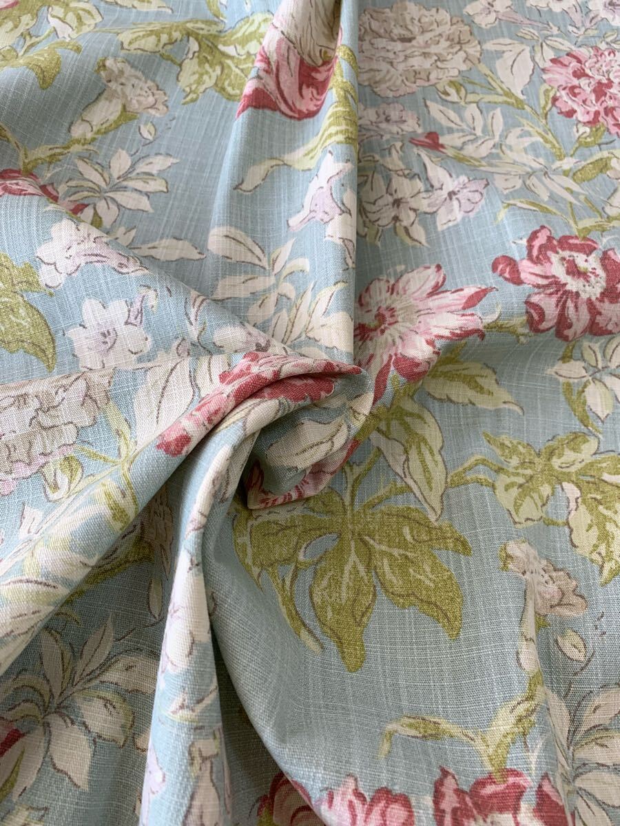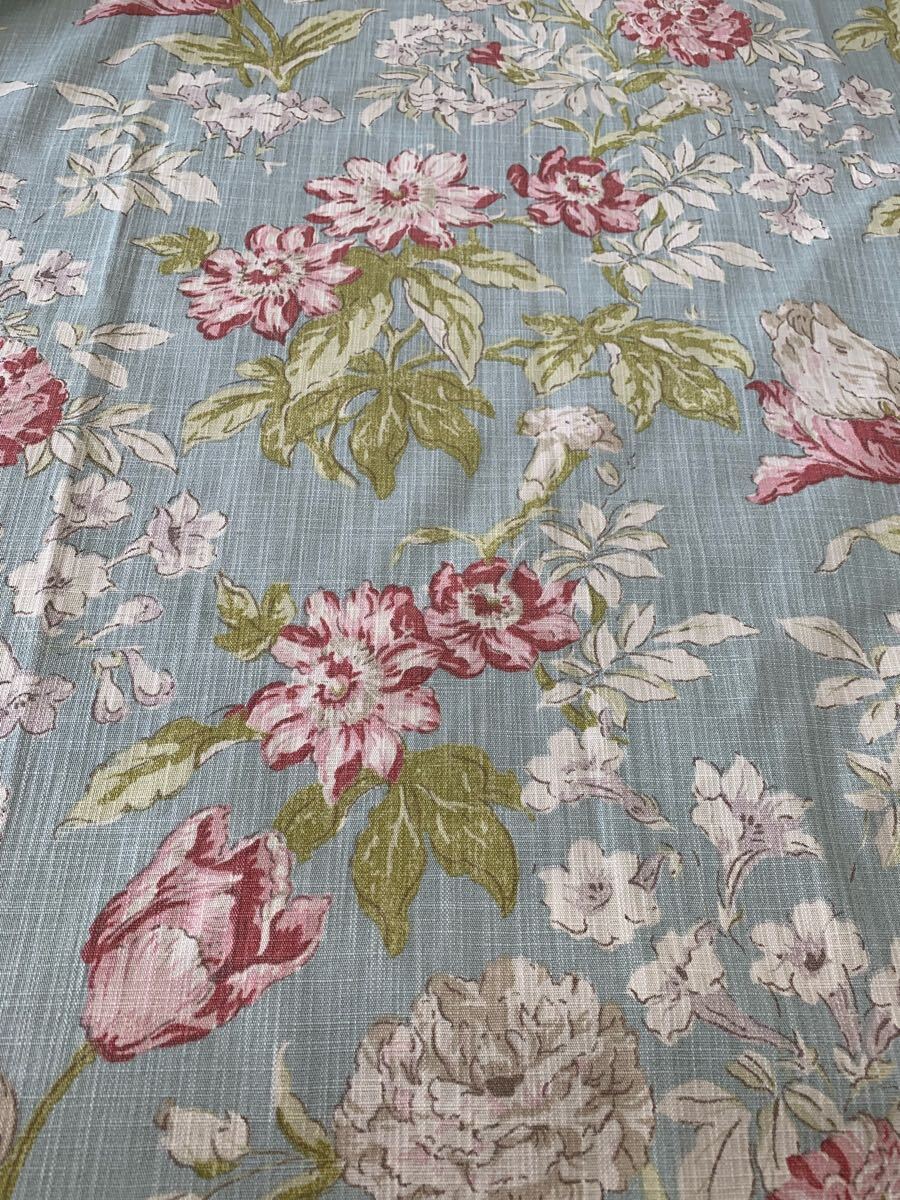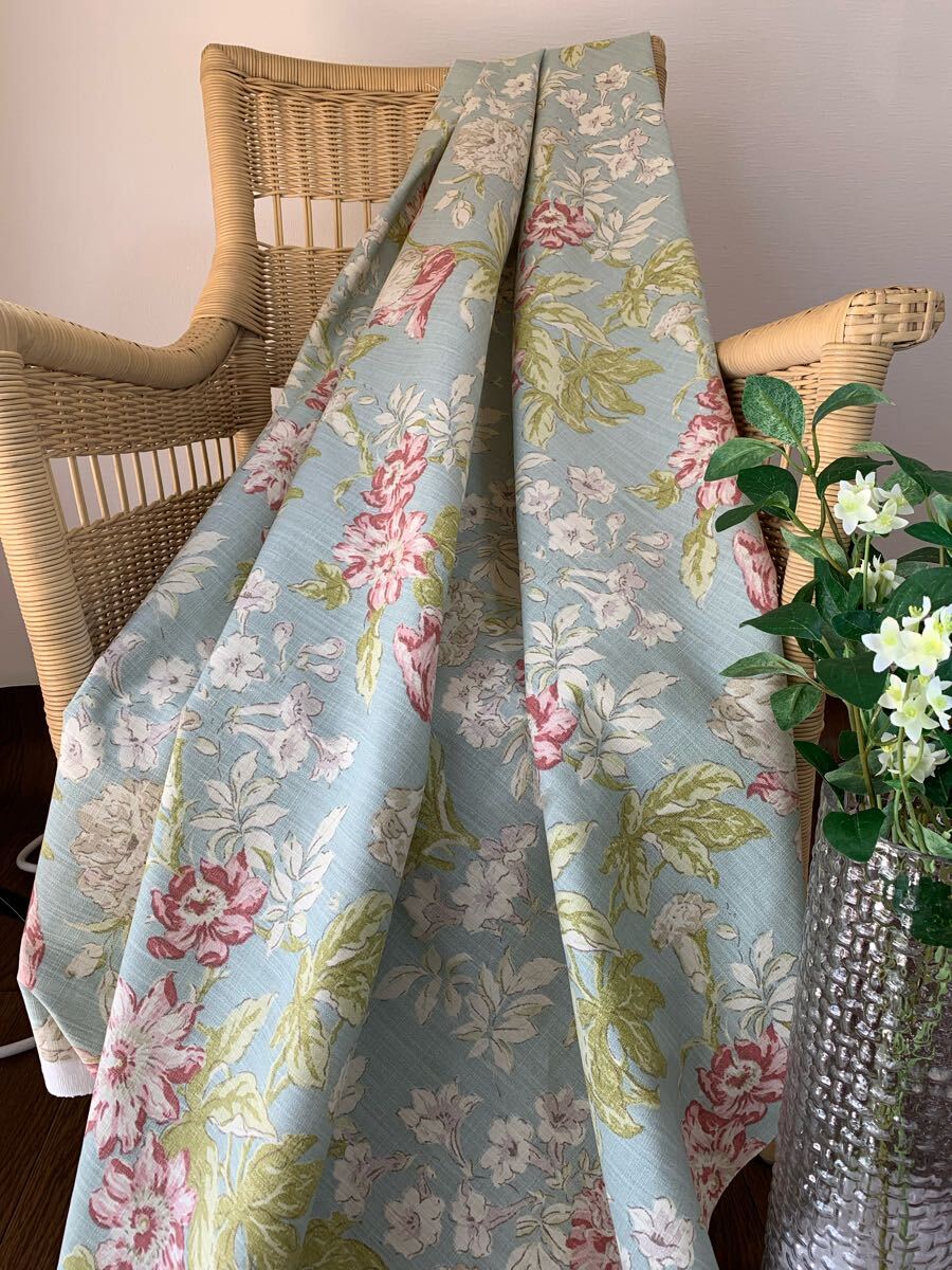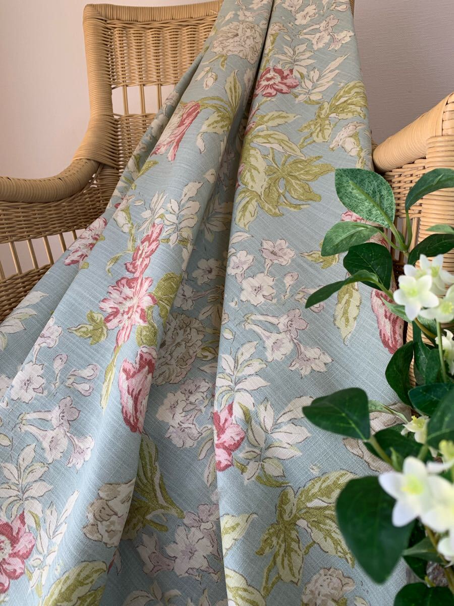 【癒される配色の一品】イギリス製、カーテン・インテリア専用のしっかりしたプリント生地●薄いペパーミントグリーン地にチューリップやナデシコ・カーネーションなどの小花を控えめに優しく描いた和風にも通じる・素敵な生地です。●テーブルクロス・エプロン・クッションカバー・バッグ作り・帽子作り・座布団・カルトナージュ・等