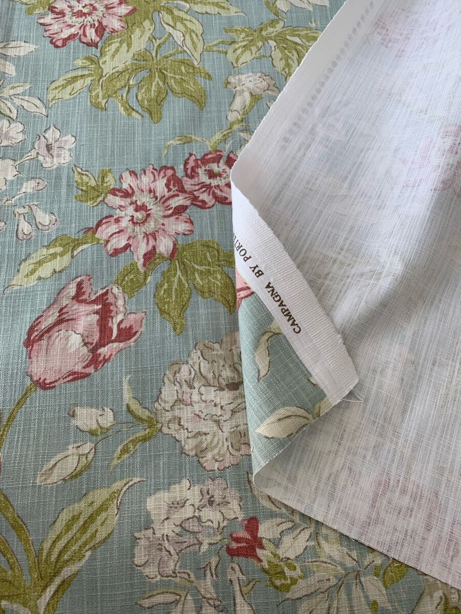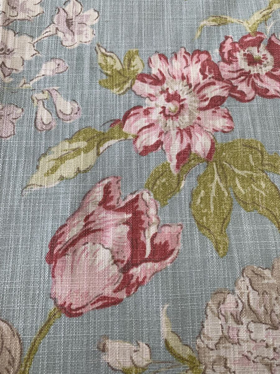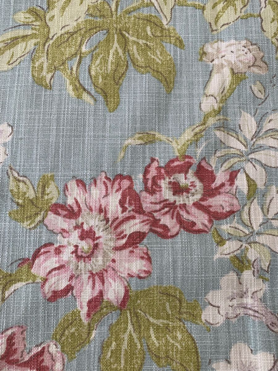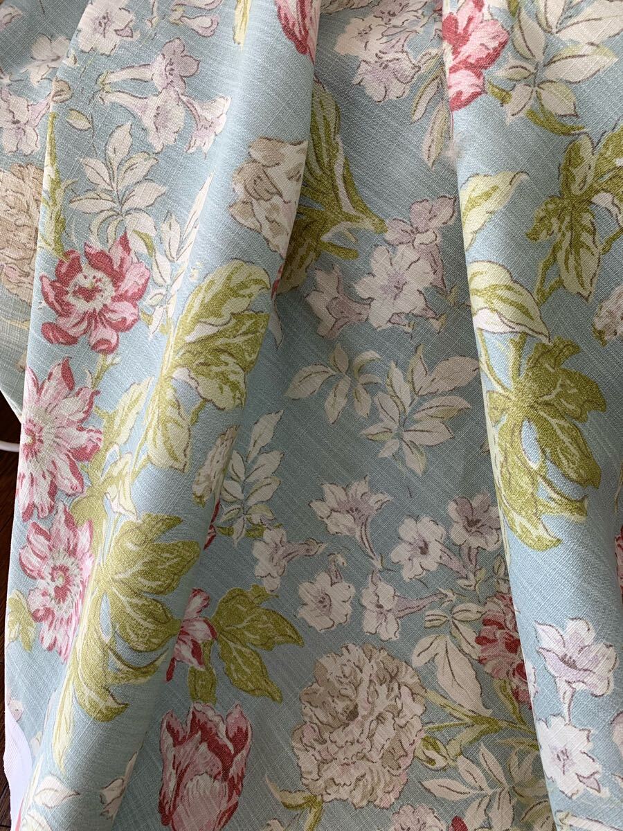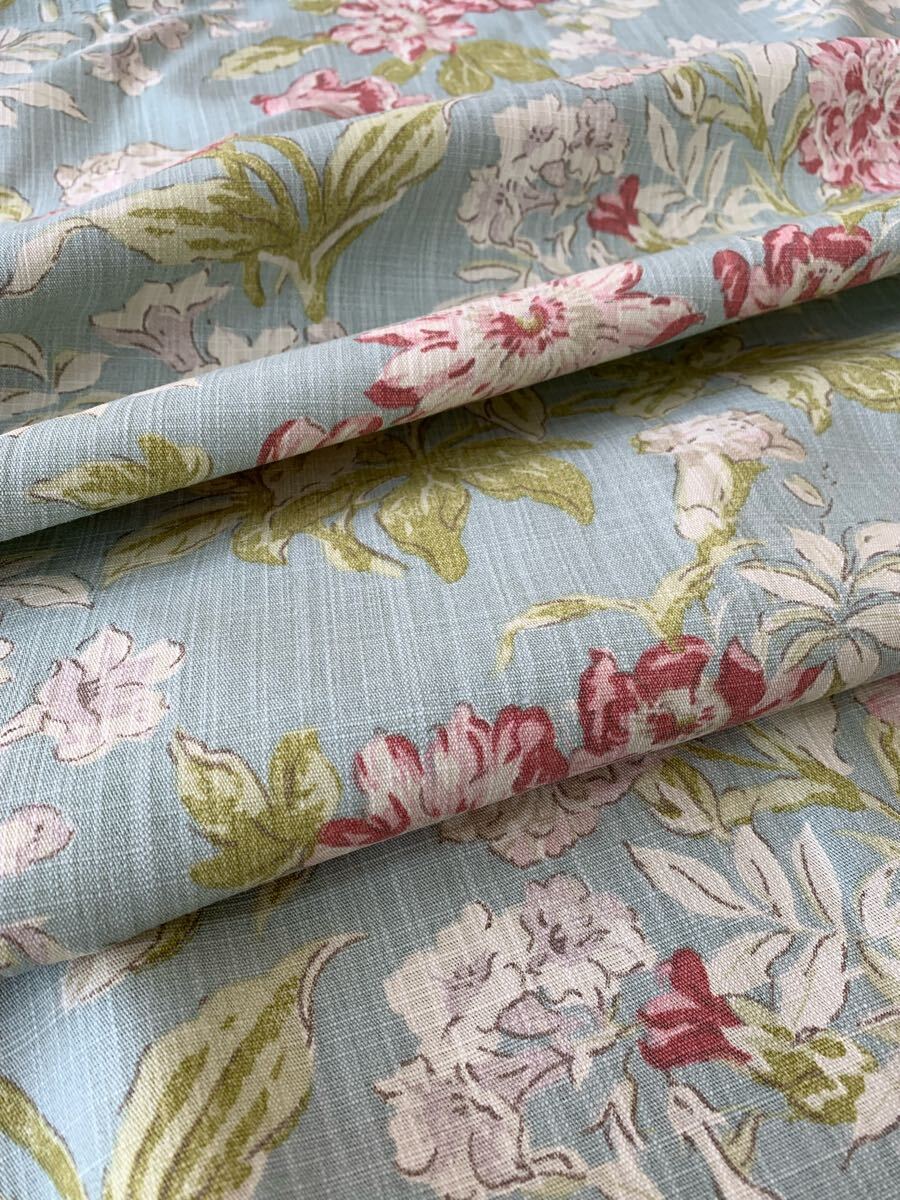 【癒される配色の一品】イギリス製、カーテン・インテリア専用のしっかりしたプリント生地●薄いペパーミントグリーン地にチューリップやナデシコ・カーネーションなどの小花を控えめに優しく描いた和風にも通じる・素敵な生地です。●テーブルクロス・エプロン・クッションカバー・バッグ作り・帽子作り・座布団・カルトナージュ・等